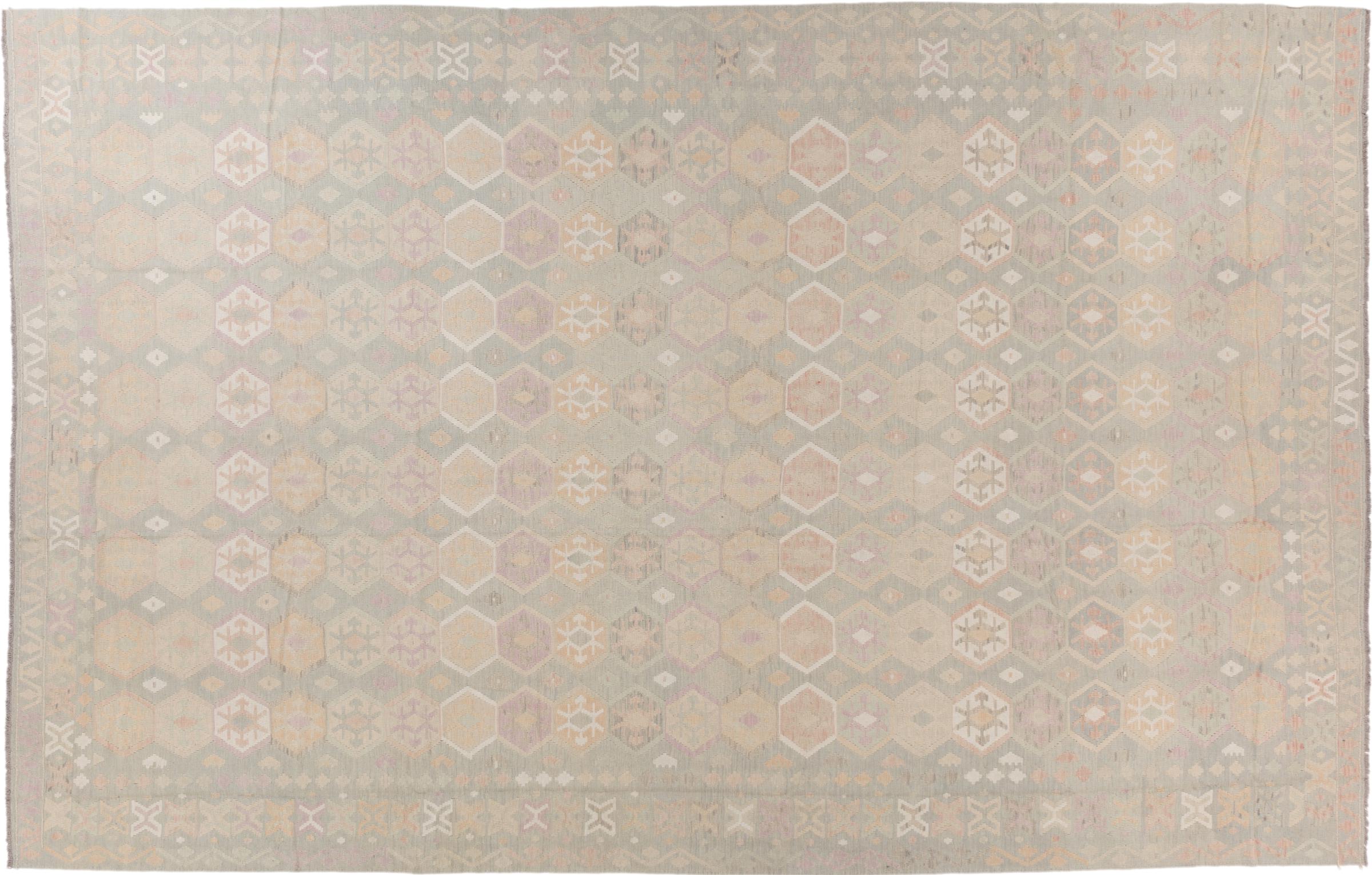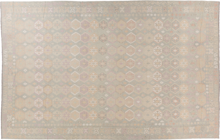 Denna kelimmatta är väldigt speciell eftersom den inte bara är vävd för hand, utan dess ull är också handspunnen. Kilim Heritage-kollektionen erbjuder en högmodern design i pastellfärger och i kombination med det mest traditionella hantverket från Orienten. Stort värde och helt överkomligt. Du kommer inte att hitta ett unikt föremål som detta igen.
