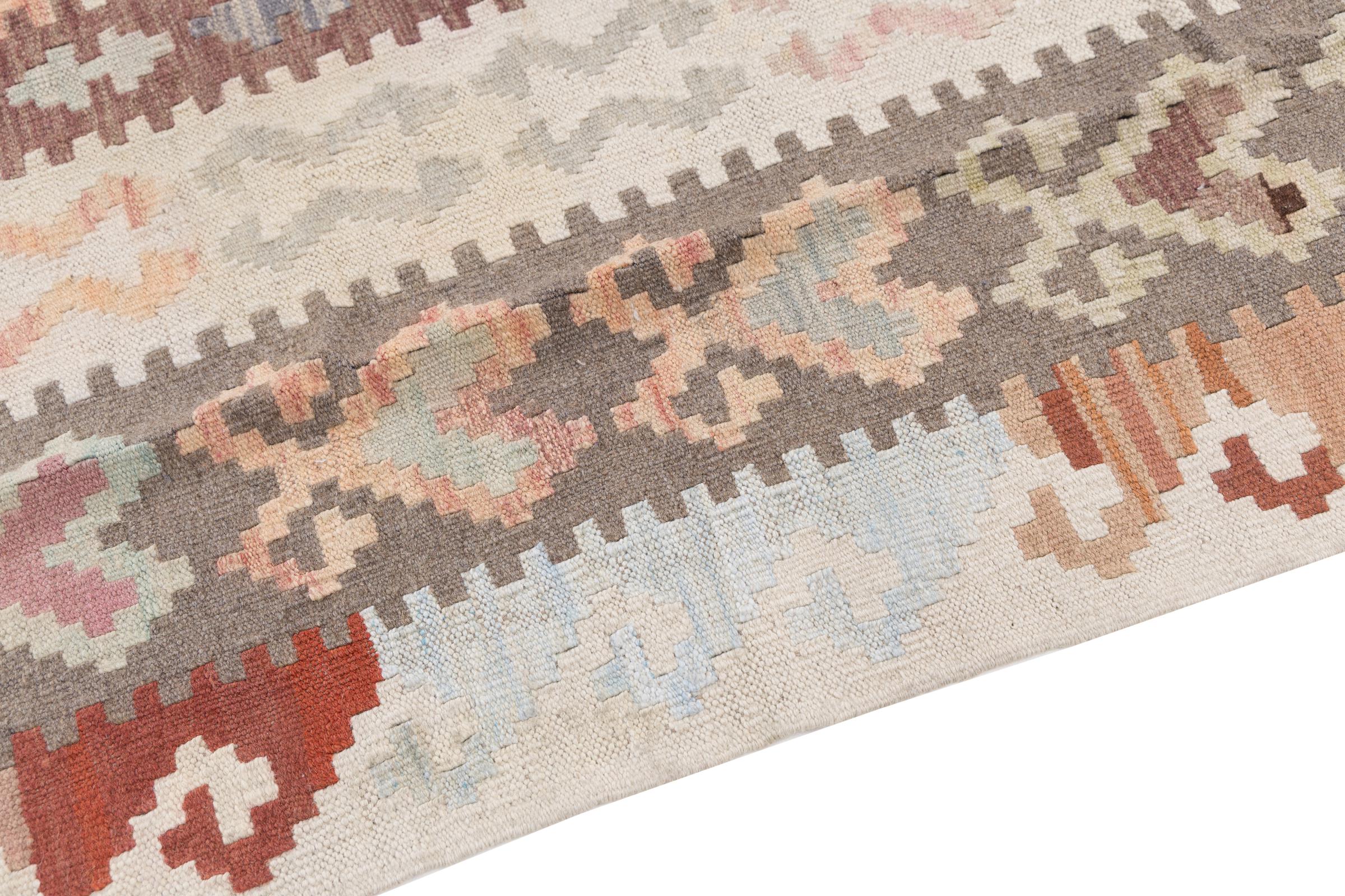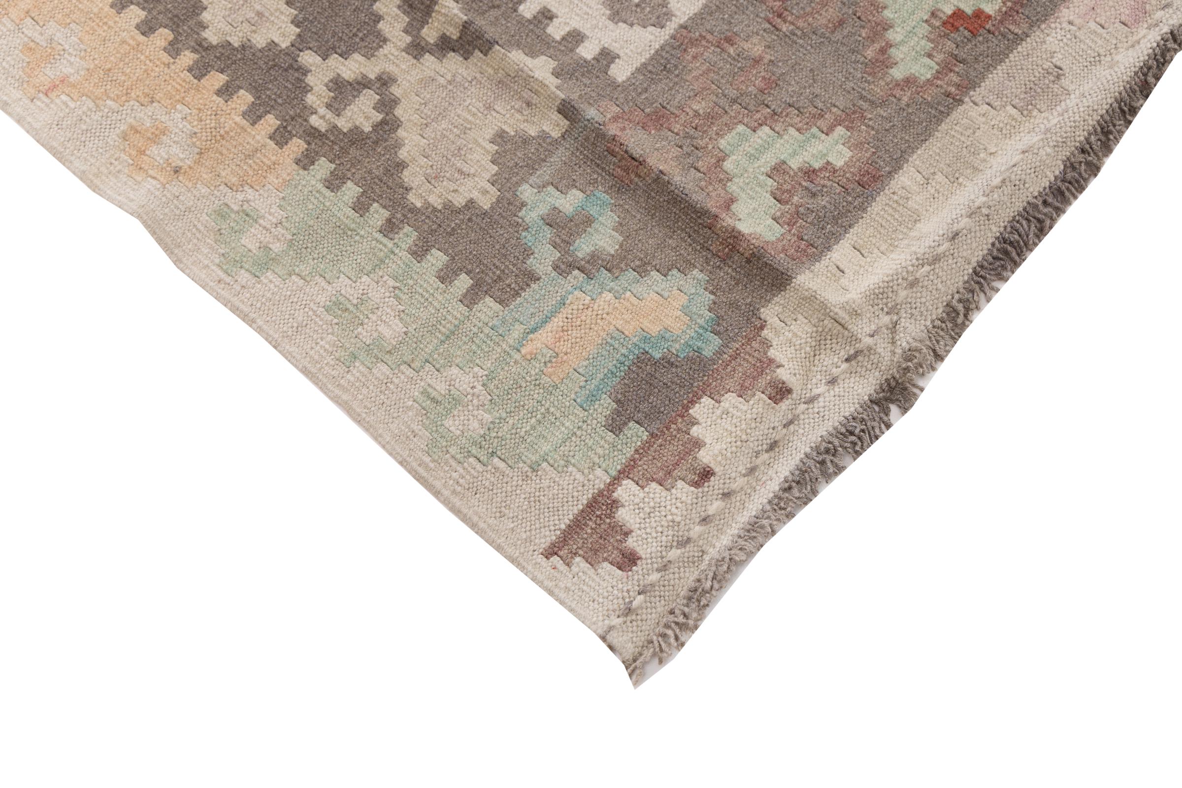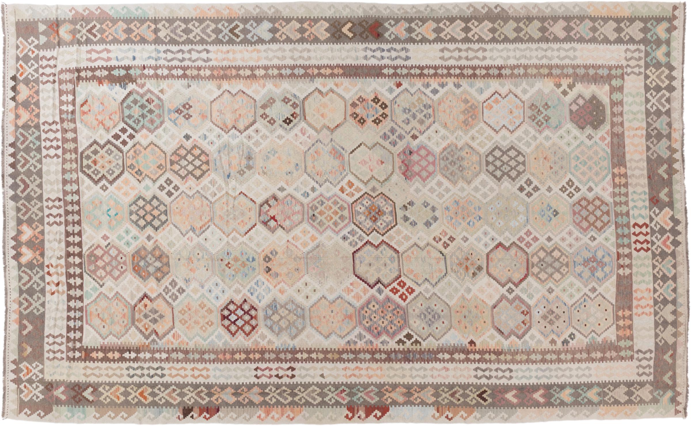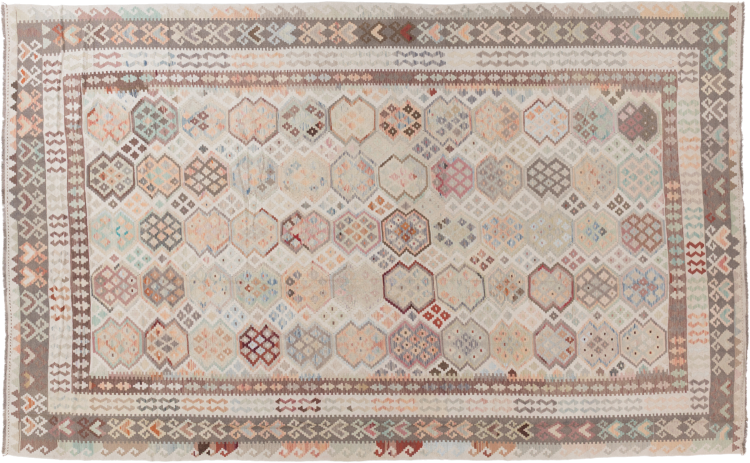 Denna kelimmatta är väldigt speciell eftersom den inte bara är vävd för hand, utan dess ull är också handspunnen. Kilim Heritage-kollektionen erbjuder en högmodern design i pastellfärger och i kombination med det mest traditionella hantverket från Orienten. Stort värde och helt överkomligt. Du kommer inte att hitta ett unikt föremål som detta igen.