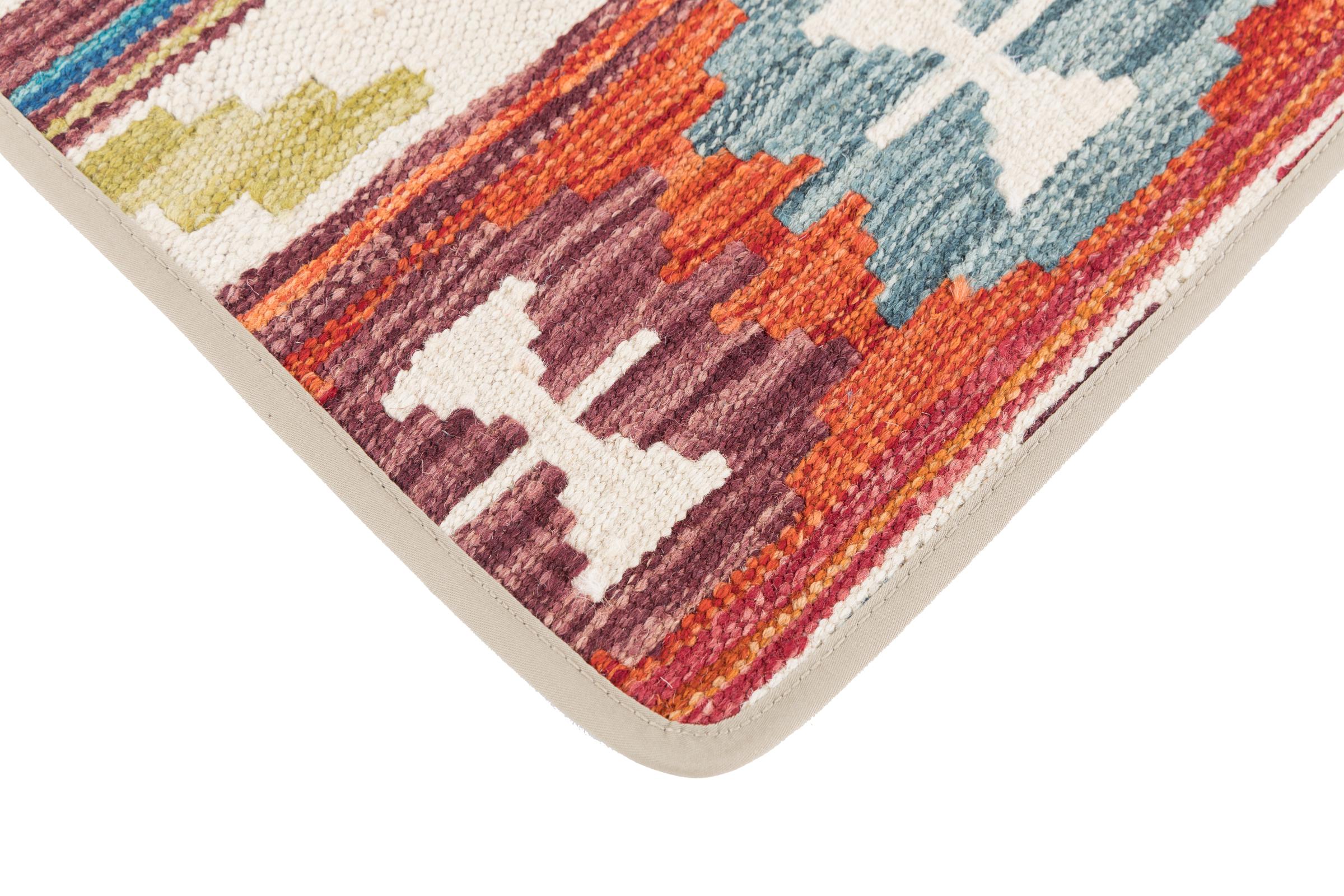 Denna handvävda kelim afghan är vacker tack vare de mångfacetterade färgerna och det typiska mönstret. Den var handvävd i Afghanistan av 100 % fårull. Den är utan tvekan mer robust och hållbar än maskintillverkade mattor. Dessutom har denna kelim en alldeles egen karaktär. En unik pjäs för dig och ditt hem som du aldrig kommer att hitta igen.