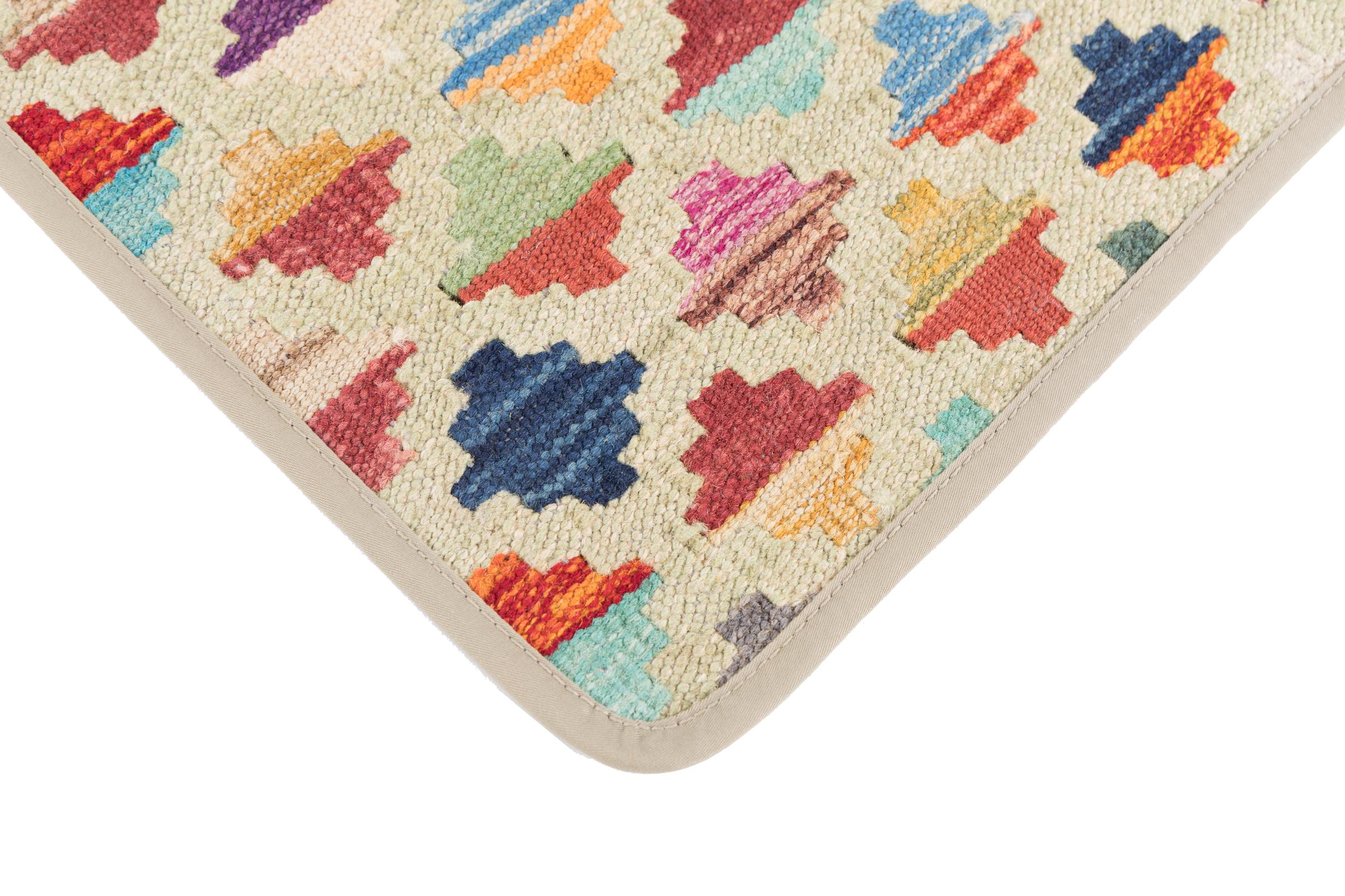 Denna handvävda kelim afghan är vacker tack vare de mångfacetterade färgerna och det typiska mönstret. Den var handvävd i Afghanistan av 100 % fårull. Den är utan tvekan mer robust och hållbar än maskintillverkade mattor. Dessutom har denna kelim en alldeles egen karaktär. En unik pjäs för dig och ditt hem som du aldrig kommer att hitta igen.