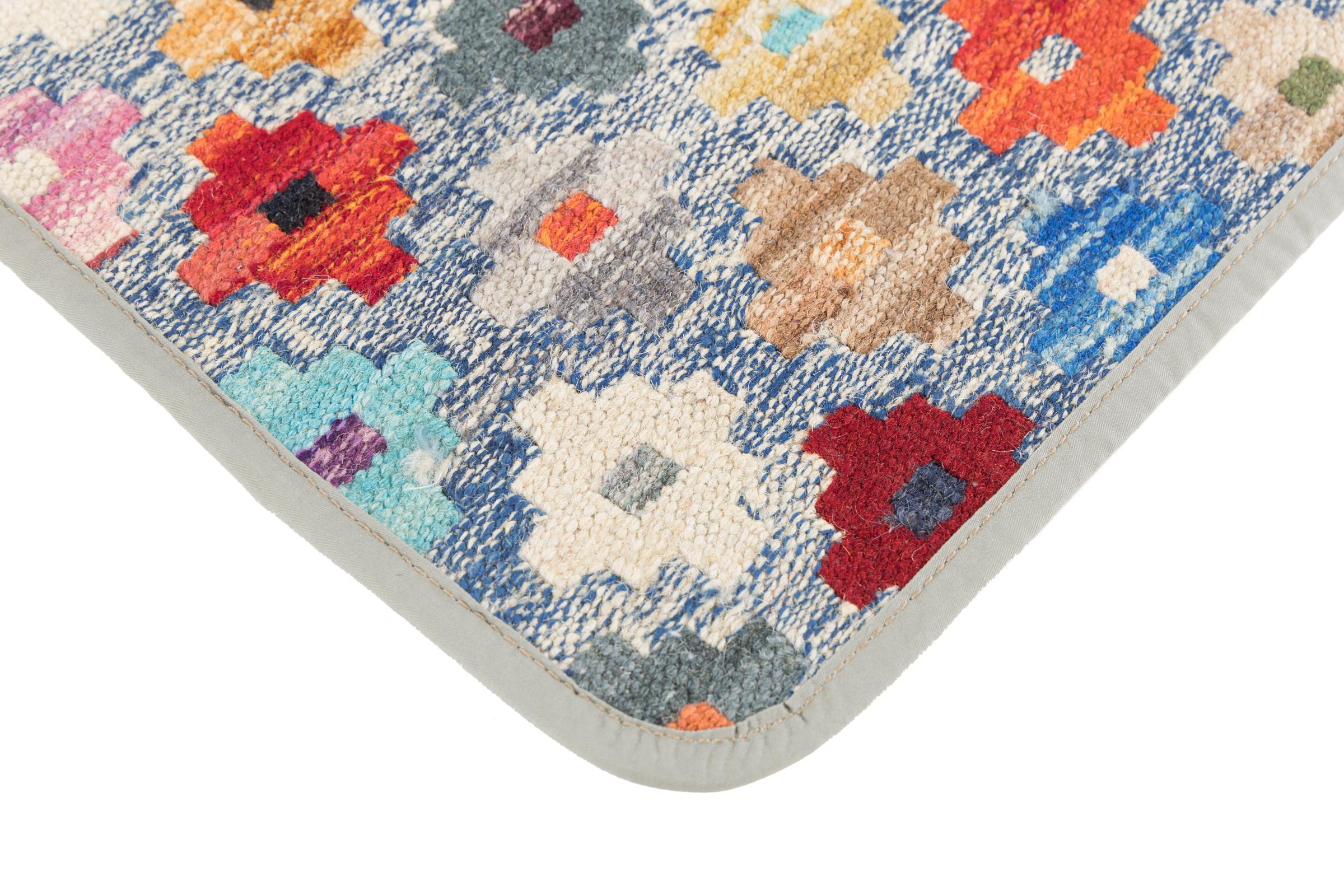 Denna handvävda kelim afghan är vacker tack vare de mångfacetterade färgerna och det typiska mönstret. Den var handvävd i Afghanistan av 100 % fårull. Den är utan tvekan mer robust och hållbar än maskintillverkade mattor. Dessutom har denna kelim en alldeles egen karaktär. En unik pjäs för dig och ditt hem som du aldrig kommer att hitta igen.