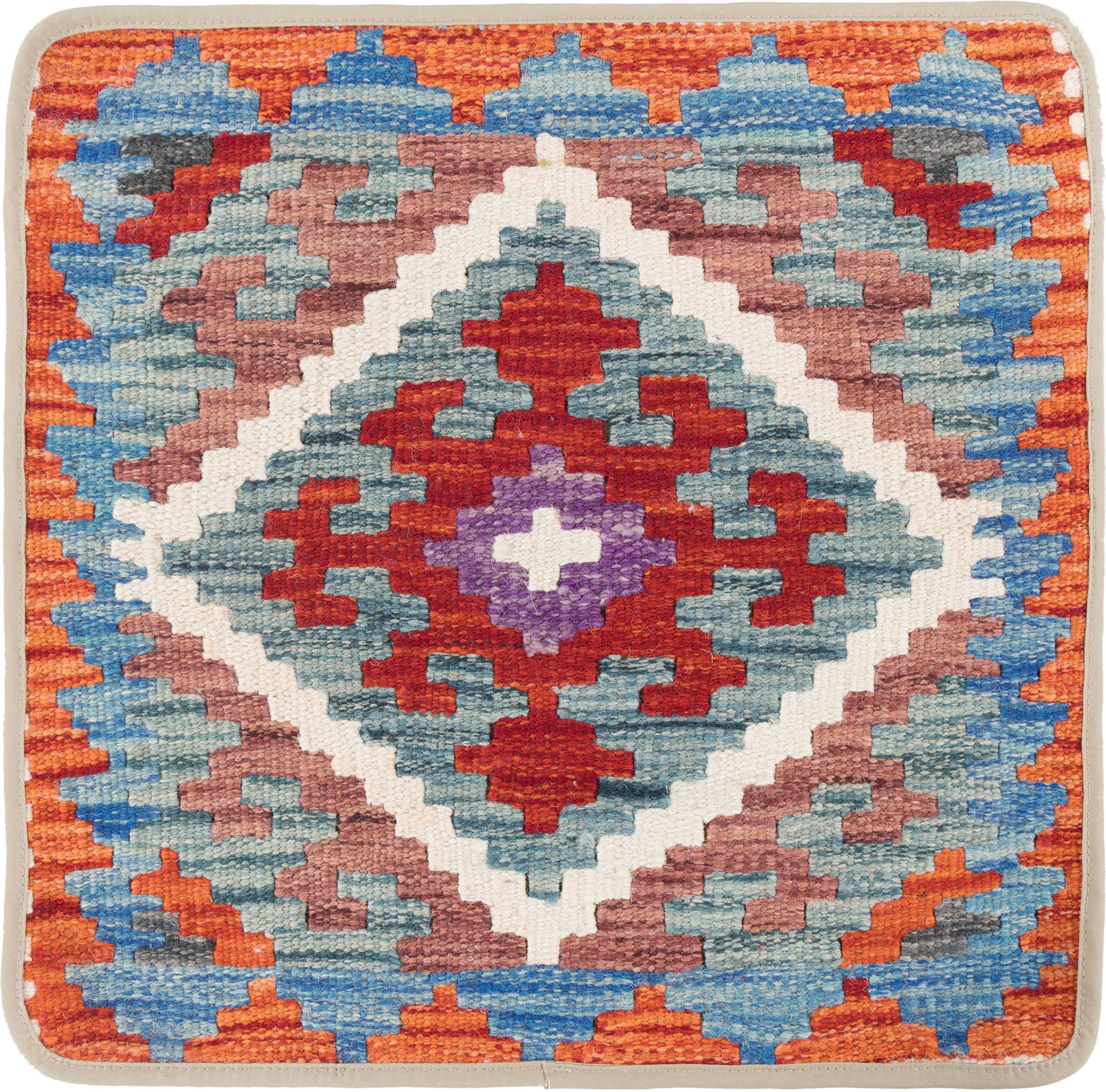 Denna handvävda kelim afghan är vacker tack vare de mångfacetterade färgerna och det typiska mönstret. Den var handvävd i Afghanistan av 100 % fårull. Den är utan tvekan mer robust och hållbar än maskintillverkade mattor. Dessutom har denna kelim en alldeles egen karaktär. En unik pjäs för dig och ditt hem som du aldrig kommer att hitta igen.