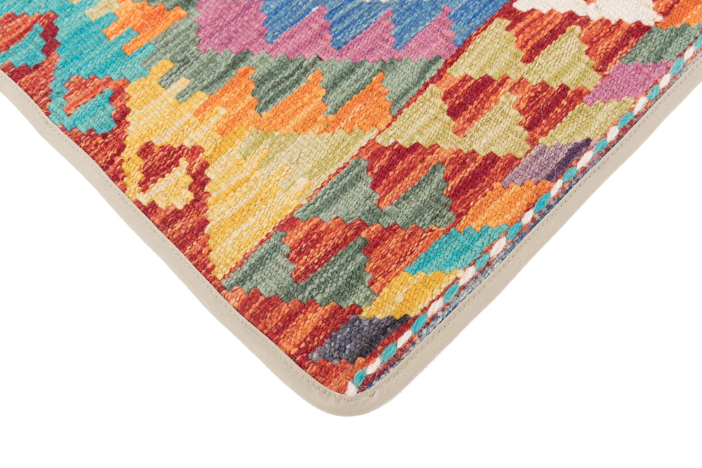 Denna handvävda kelim afghan är vacker tack vare de mångfacetterade färgerna och det typiska mönstret. Den var handvävd i Afghanistan av 100 % fårull. Den är utan tvekan mer robust och hållbar än maskintillverkade mattor. Dessutom har denna kelim en alldeles egen karaktär. En unik pjäs för dig och ditt hem som du aldrig kommer att hitta igen.