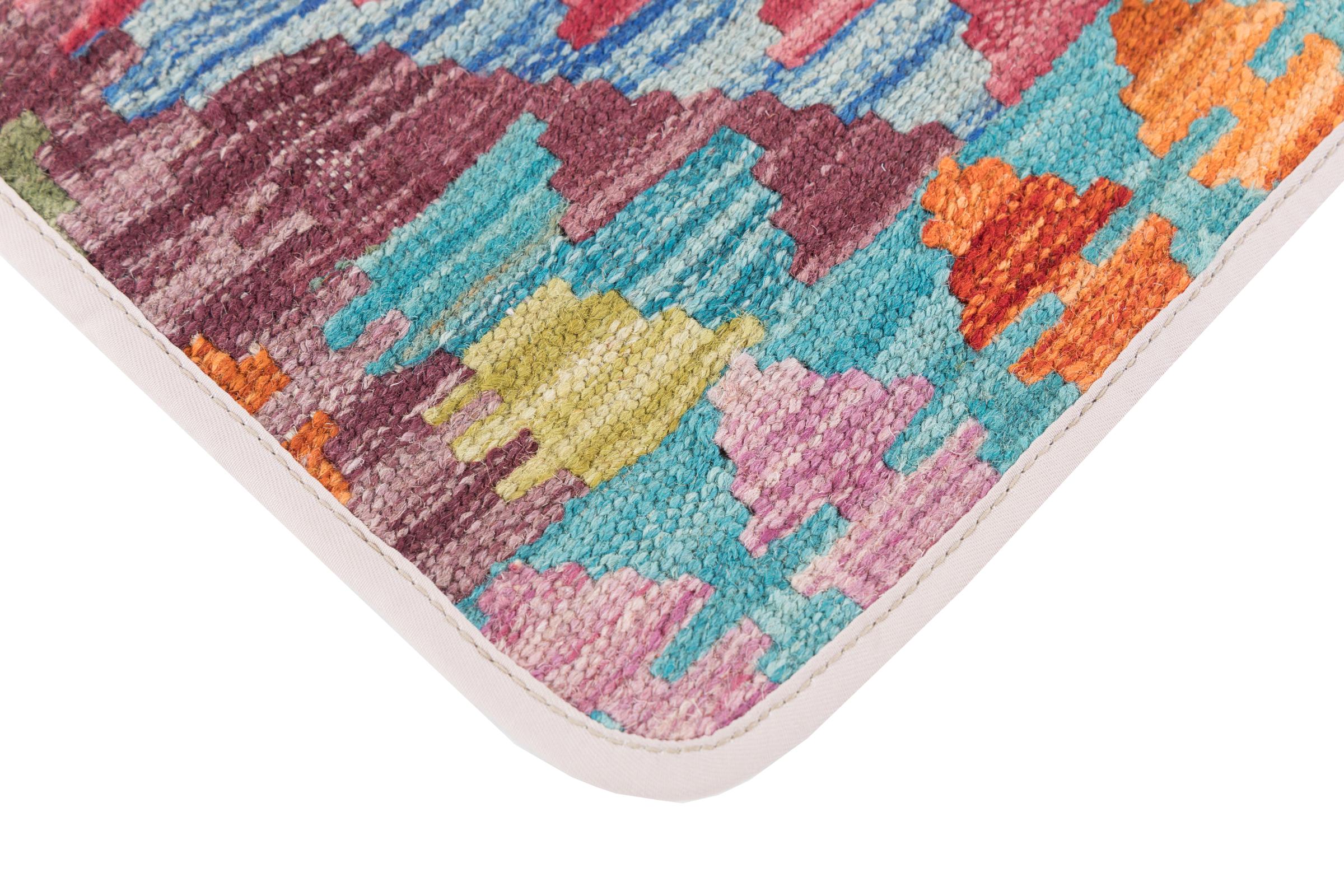 Denna handvävda kelim afghan är vacker tack vare de mångfacetterade färgerna och det typiska mönstret. Den var handvävd i Afghanistan av 100 % fårull. Den är utan tvekan mer robust och hållbar än maskintillverkade mattor. Dessutom har denna kelim en alldeles egen karaktär. En unik pjäs för dig och ditt hem som du aldrig kommer att hitta igen.