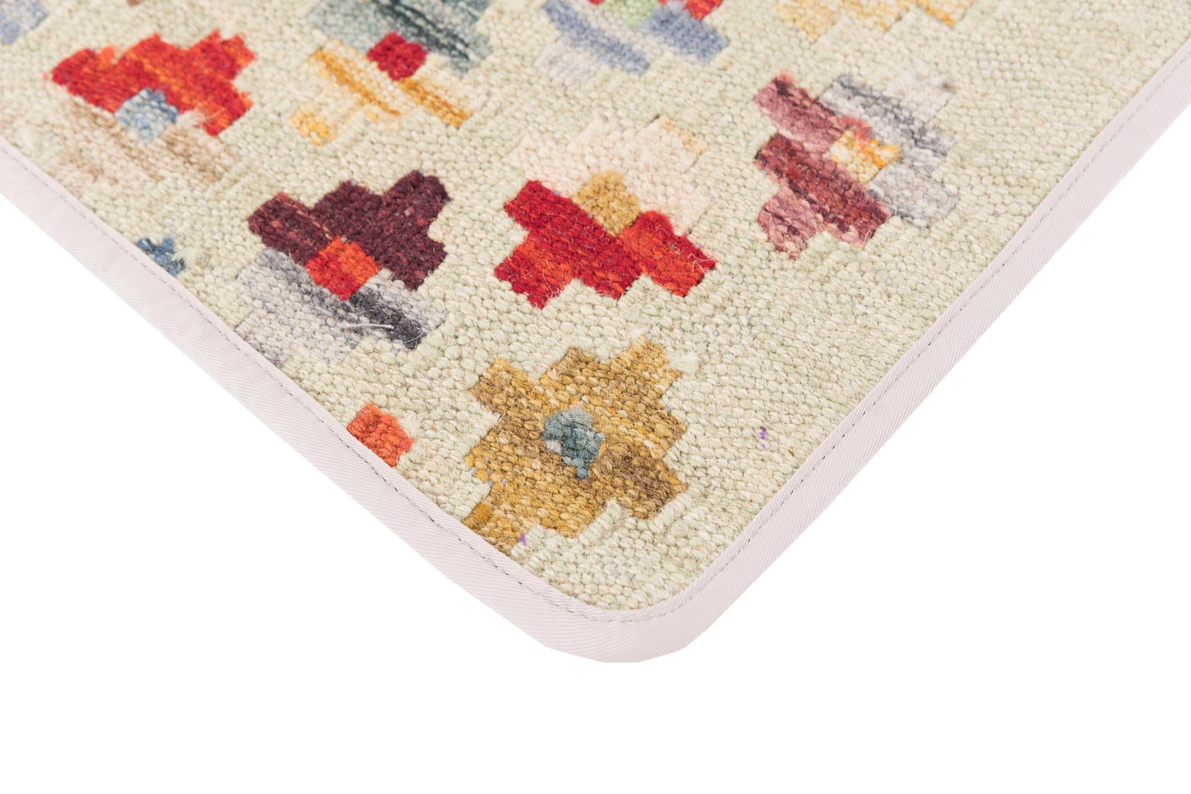 Denna handvävda kelim afghan är vacker tack vare de mångfacetterade färgerna och det typiska mönstret. Den var handvävd i Afghanistan av 100 % fårull. Den är utan tvekan mer robust och hållbar än maskintillverkade mattor. Dessutom har denna kelim en alldeles egen karaktär. En unik pjäs för dig och ditt hem som du aldrig kommer att hitta igen.