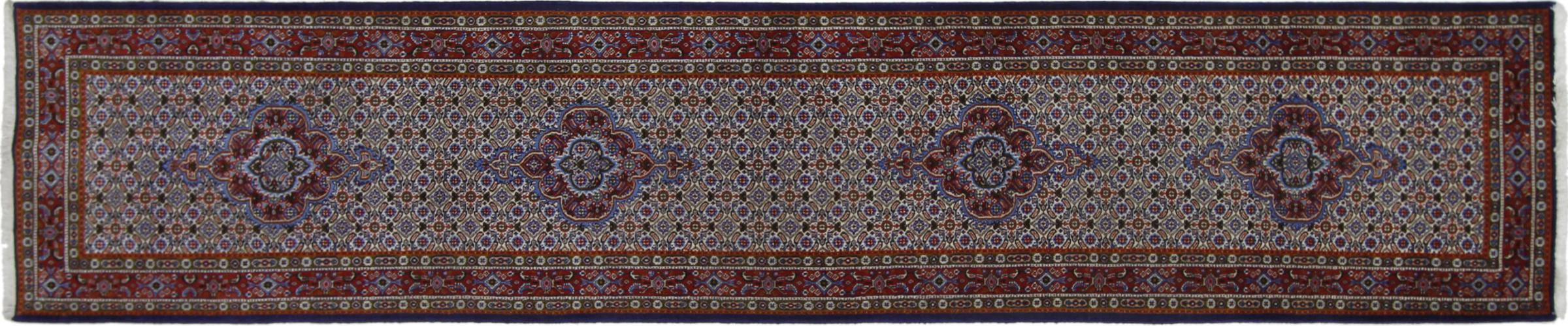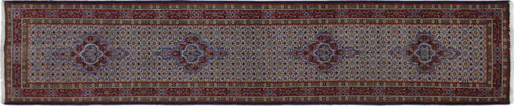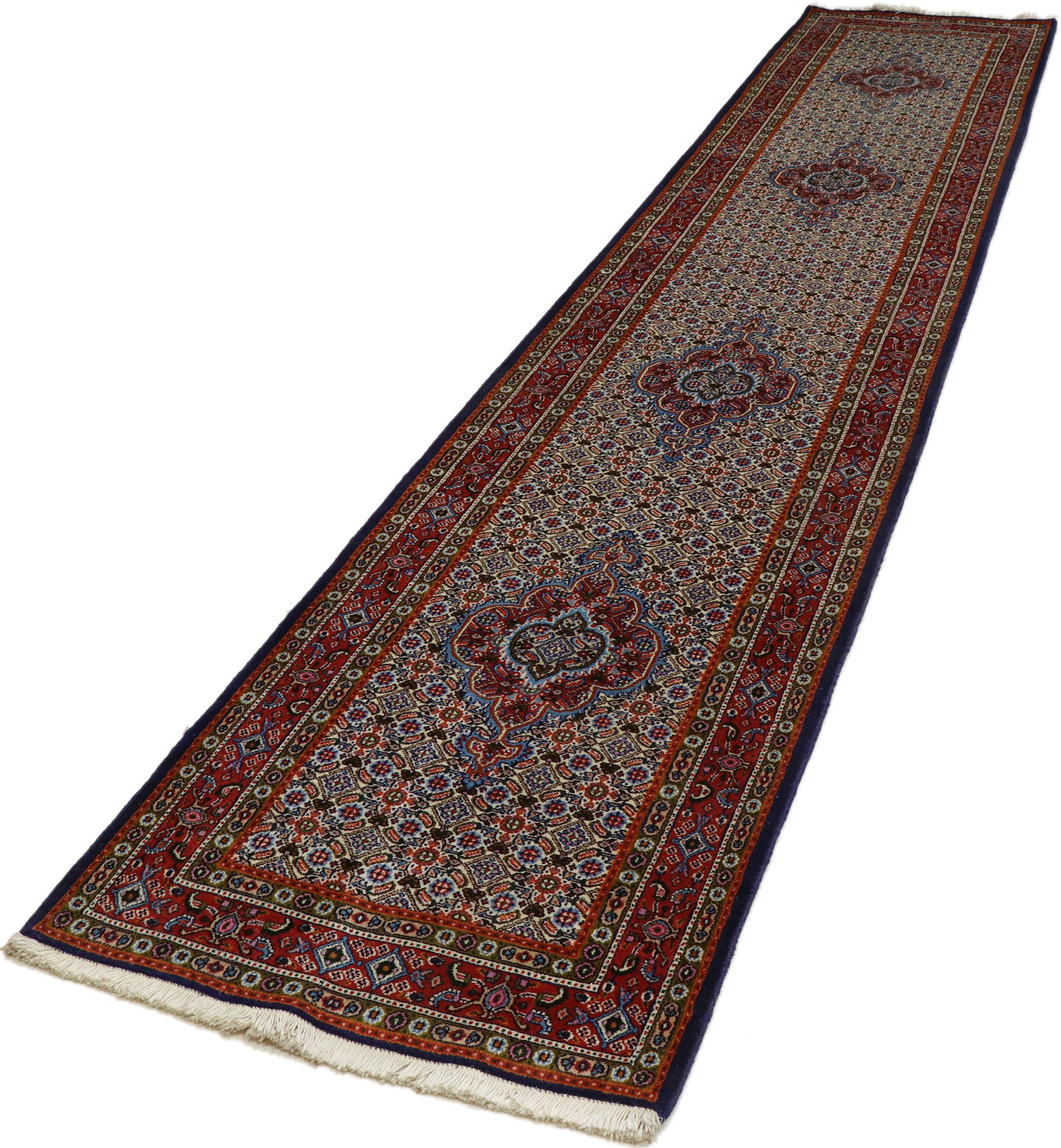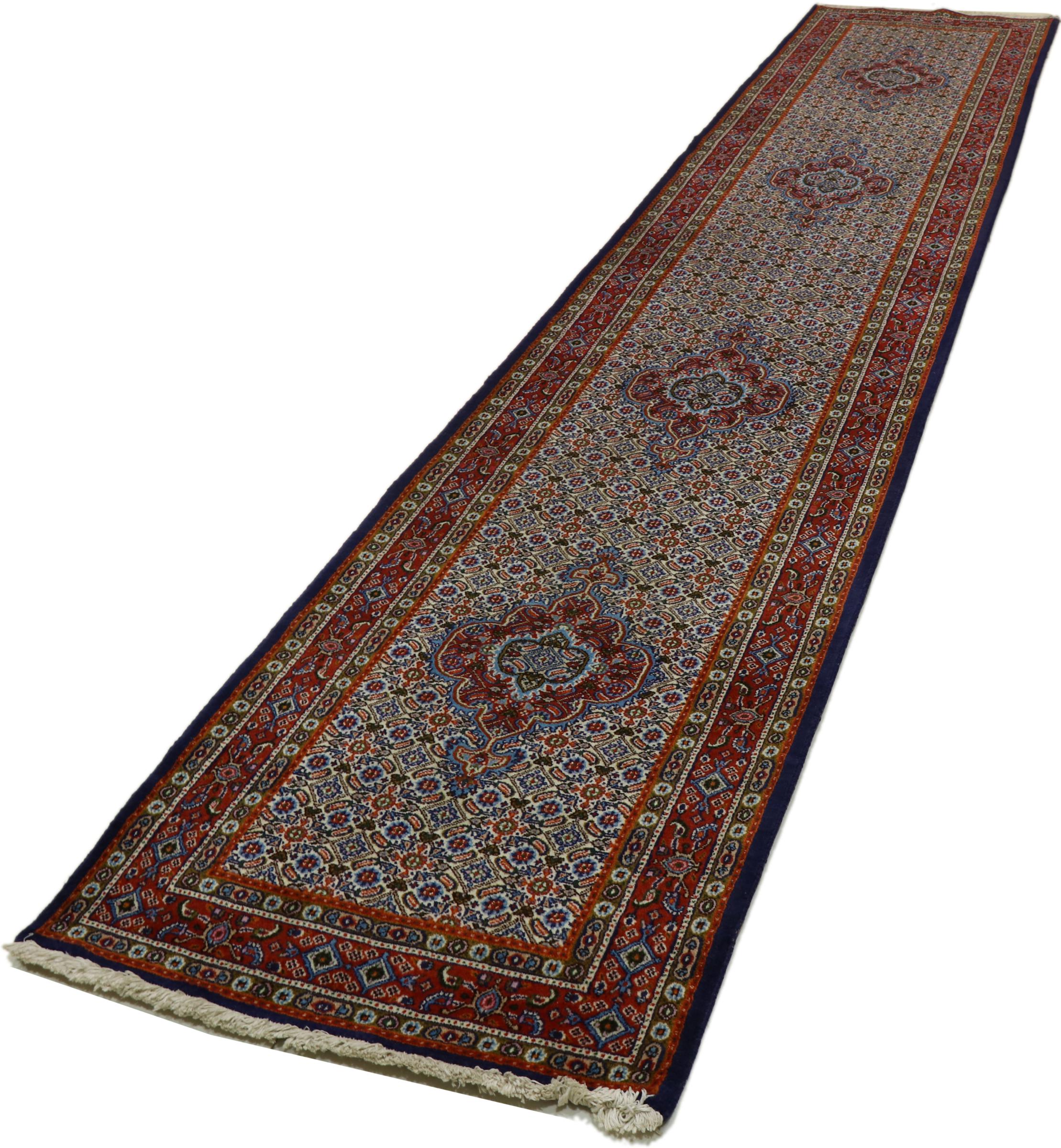 Mattans ID: 31334300261361 Storlek: 399x82 cm Tjocklek: ap. 10 mm Knuttäthet: 200 000 - 250 000 / m² Tillverkning: Knuten för hand Lugg: Ull med silke Varp: Bomull Ursprung: Persien / Iran Ålder: Ny Vikt: ap. 11 kg I lager: Unik - Endast 1 i lager
