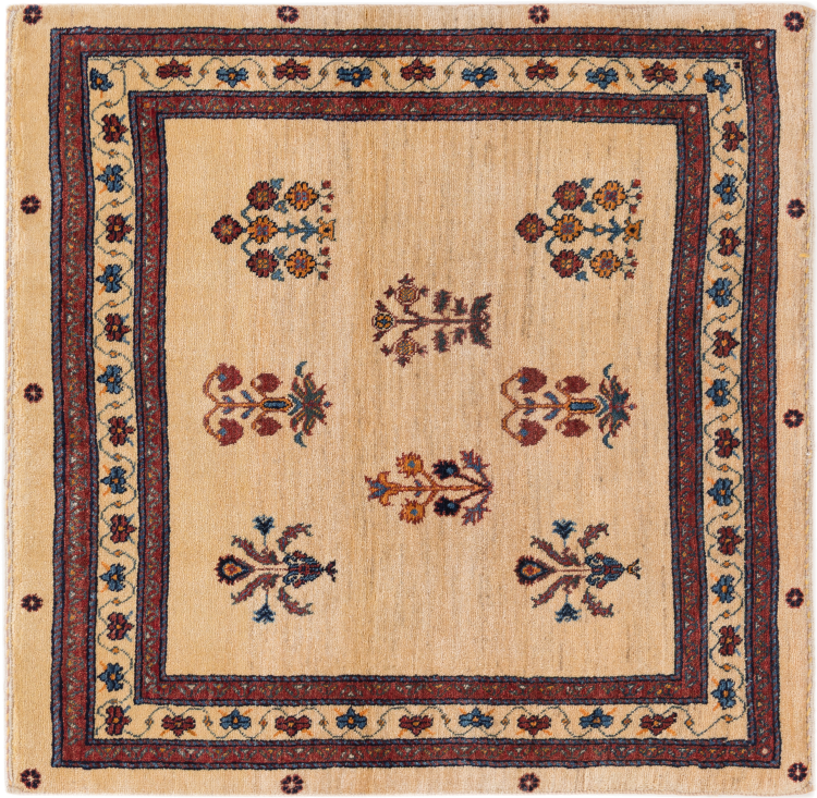 Mattans ID: 296738008515 Storlek: 103x103 cm Tjocklek: ap. 12 mm Knuttäthet: 200 000 - 250 000 / m² Tillverkning: Knuten för hand Lugg: Handspunnen ull Varp: Ull Ursprung: Persien / Iran Ålder: Ny Vikt: ap. 4 kg I lager: Unik - Endast 1 i lager