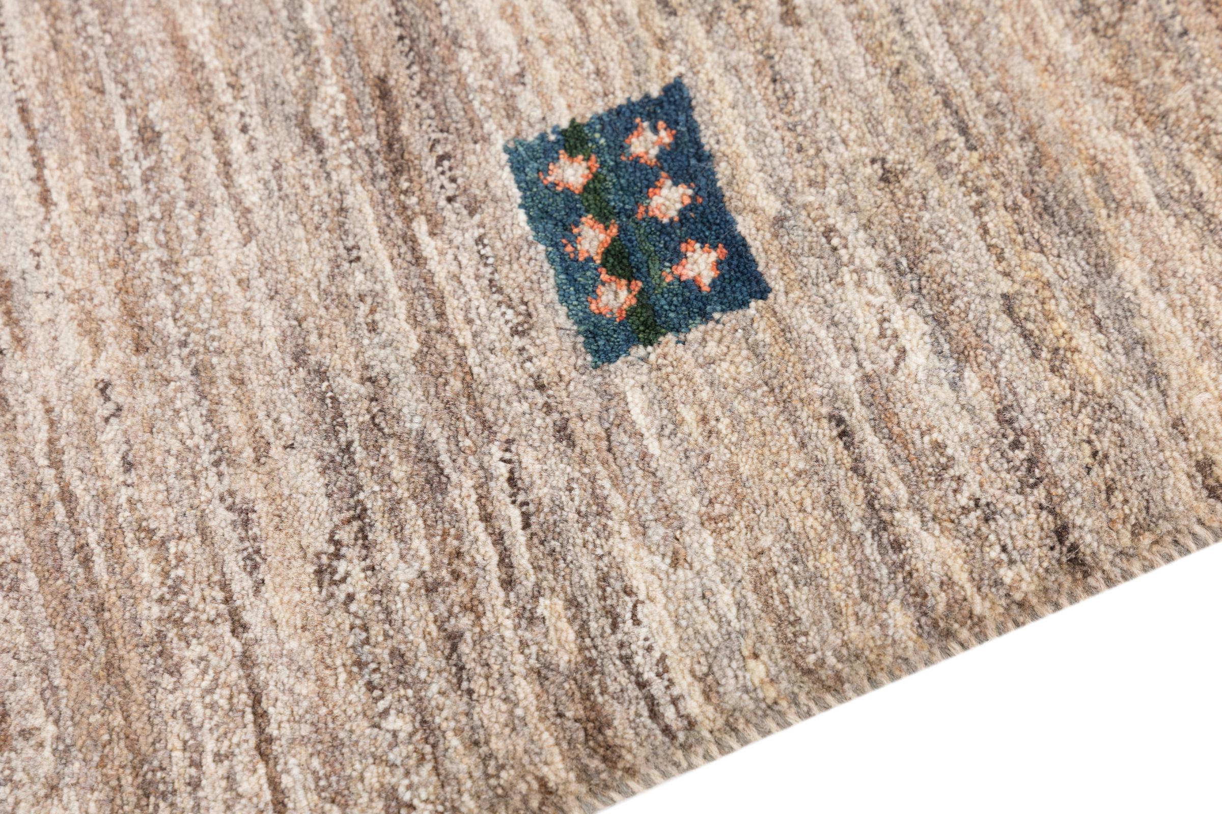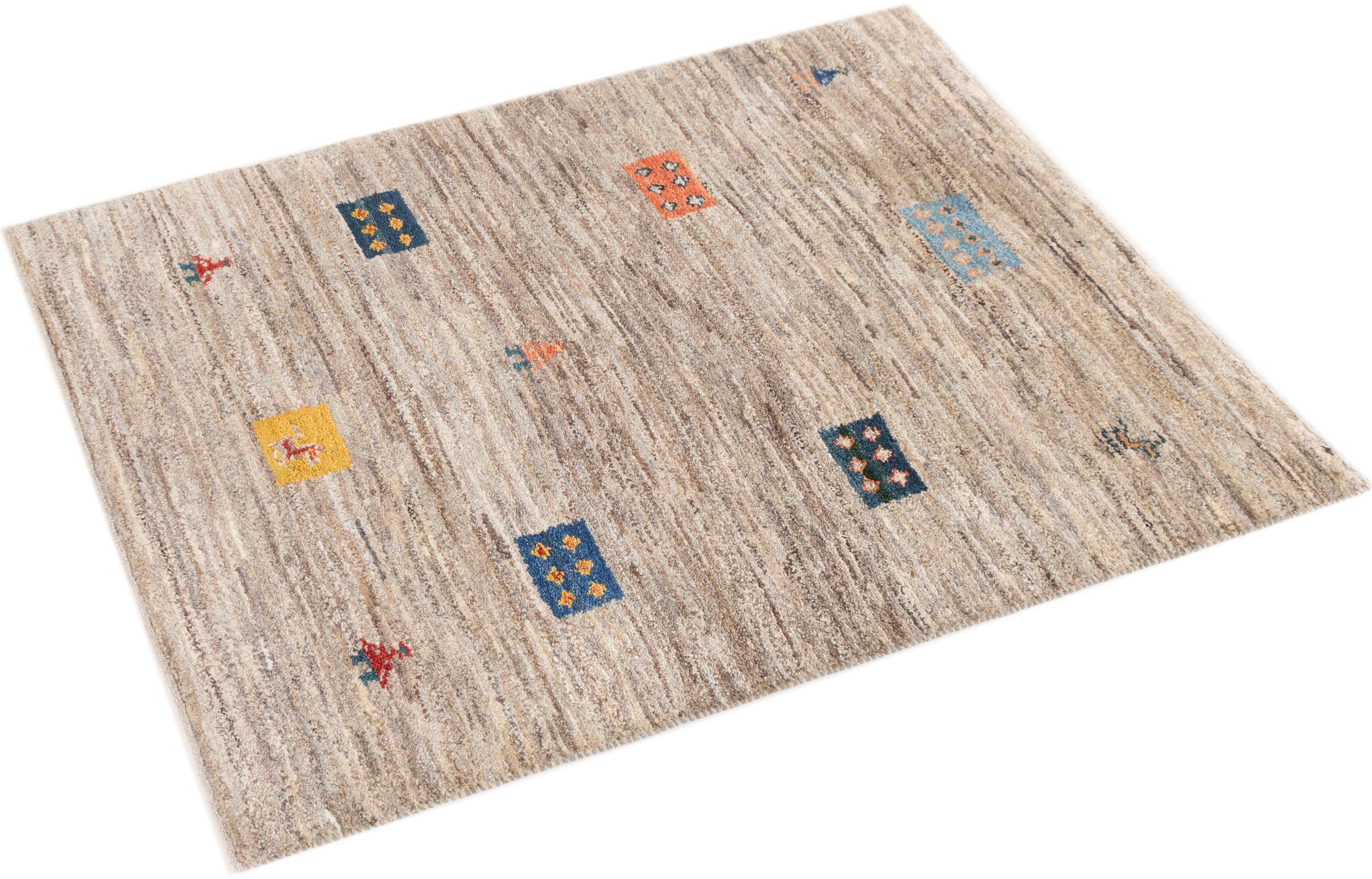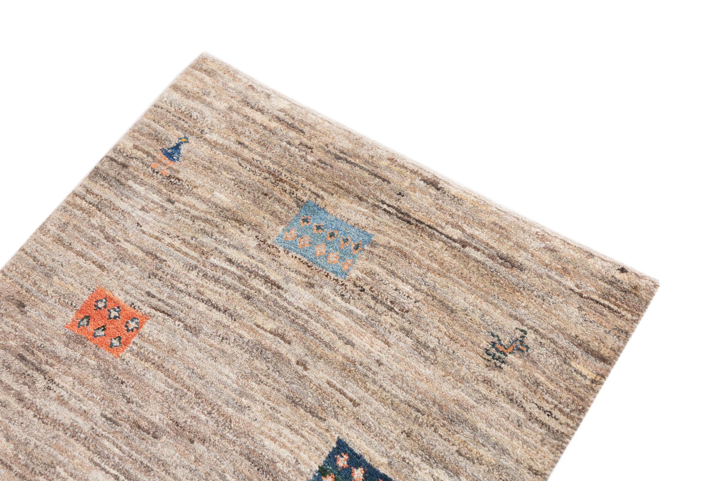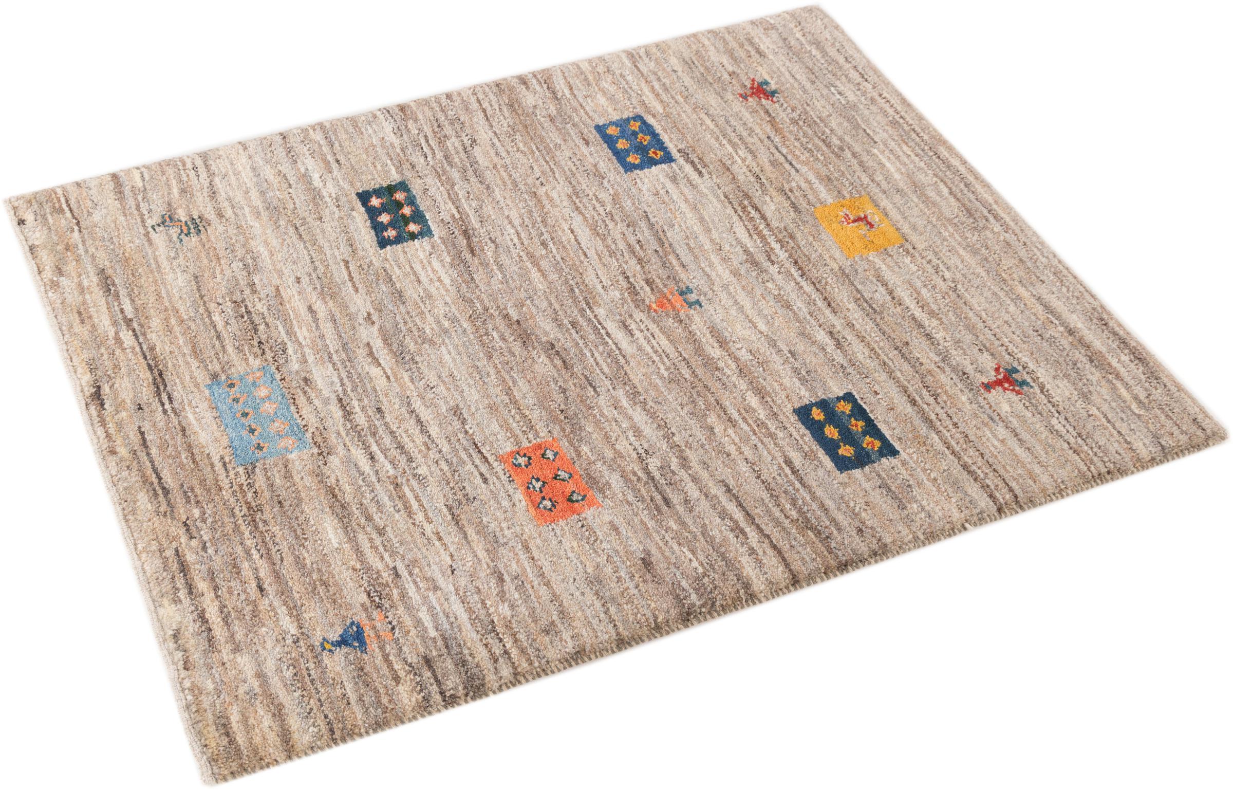 Den här vackra mattan är en persisk Gabbeh och är en av de högsta kvaliteten på Gabbeh-mattor. Mattorna är knutna av nomader eller semi-nomader i Iran med traditionellt hantverk. De enkla motiven och mönstren är mestadels inspirerade av nomaderna. Till exempel kan kameler, träd eller buskar hittas på traditionella mattor. Persiska Gabbeh-mattor är tillverkade av ull från lokala fårbesättningar. Ullen spinns därför mest för hand. Var och en av dessa orientaliska mattor förkroppsligar en unik karaktär av hundraårig kultur.