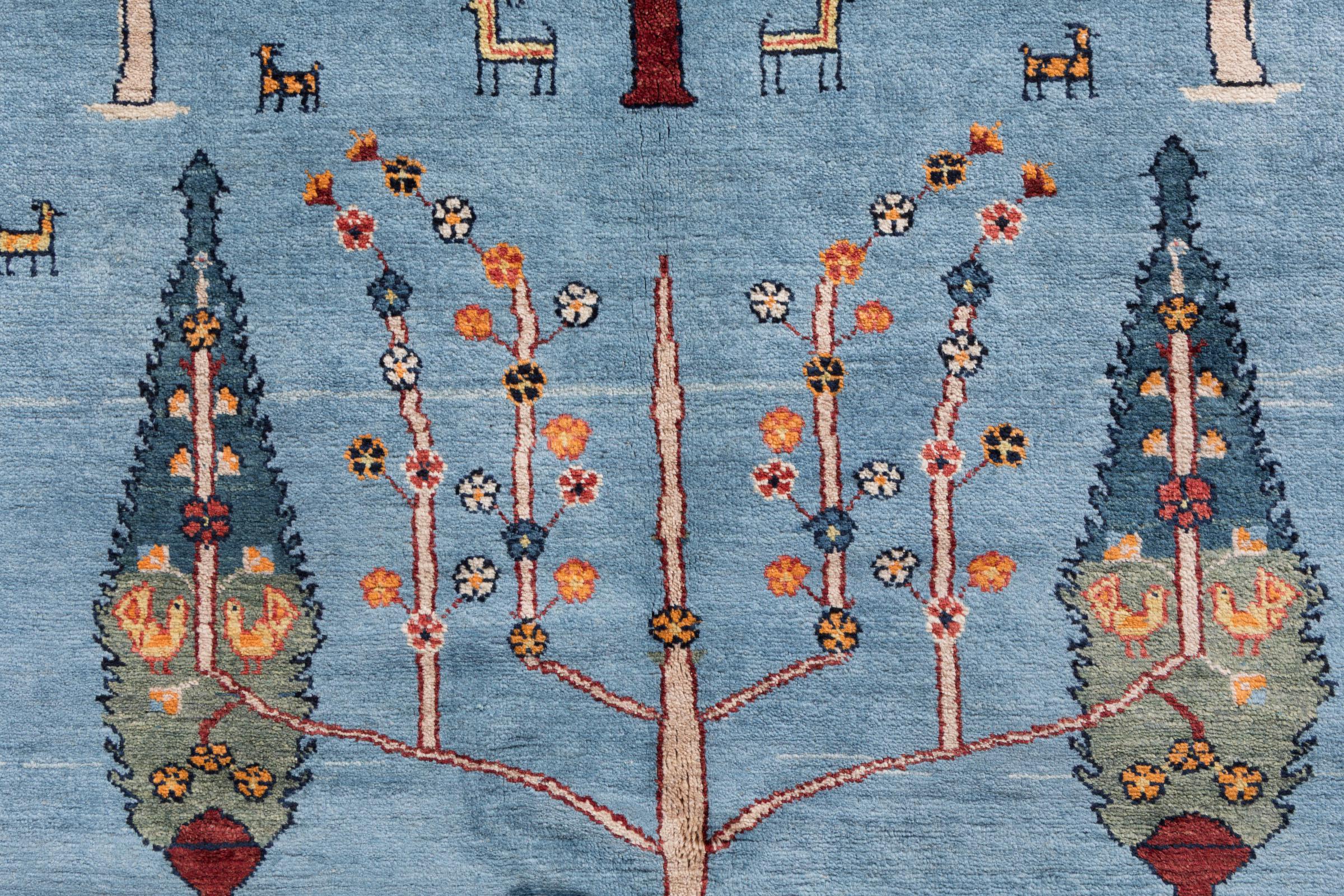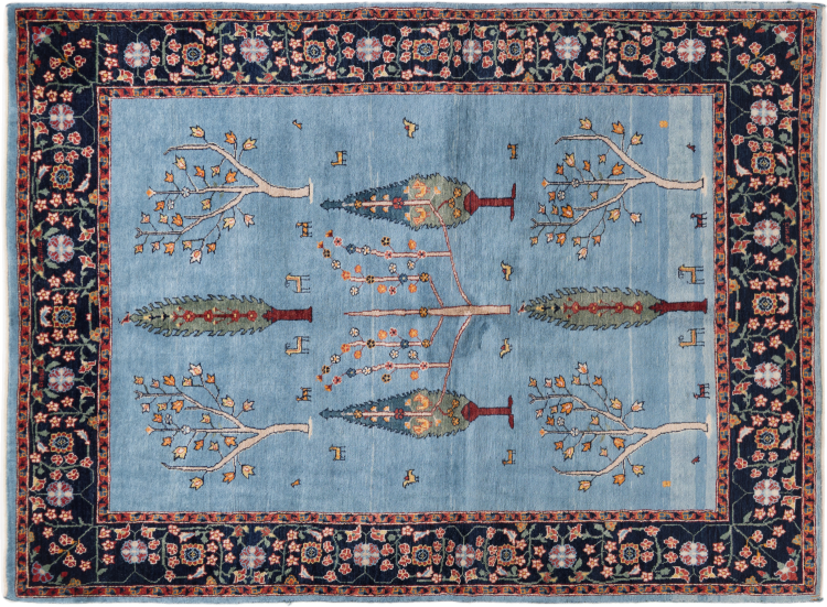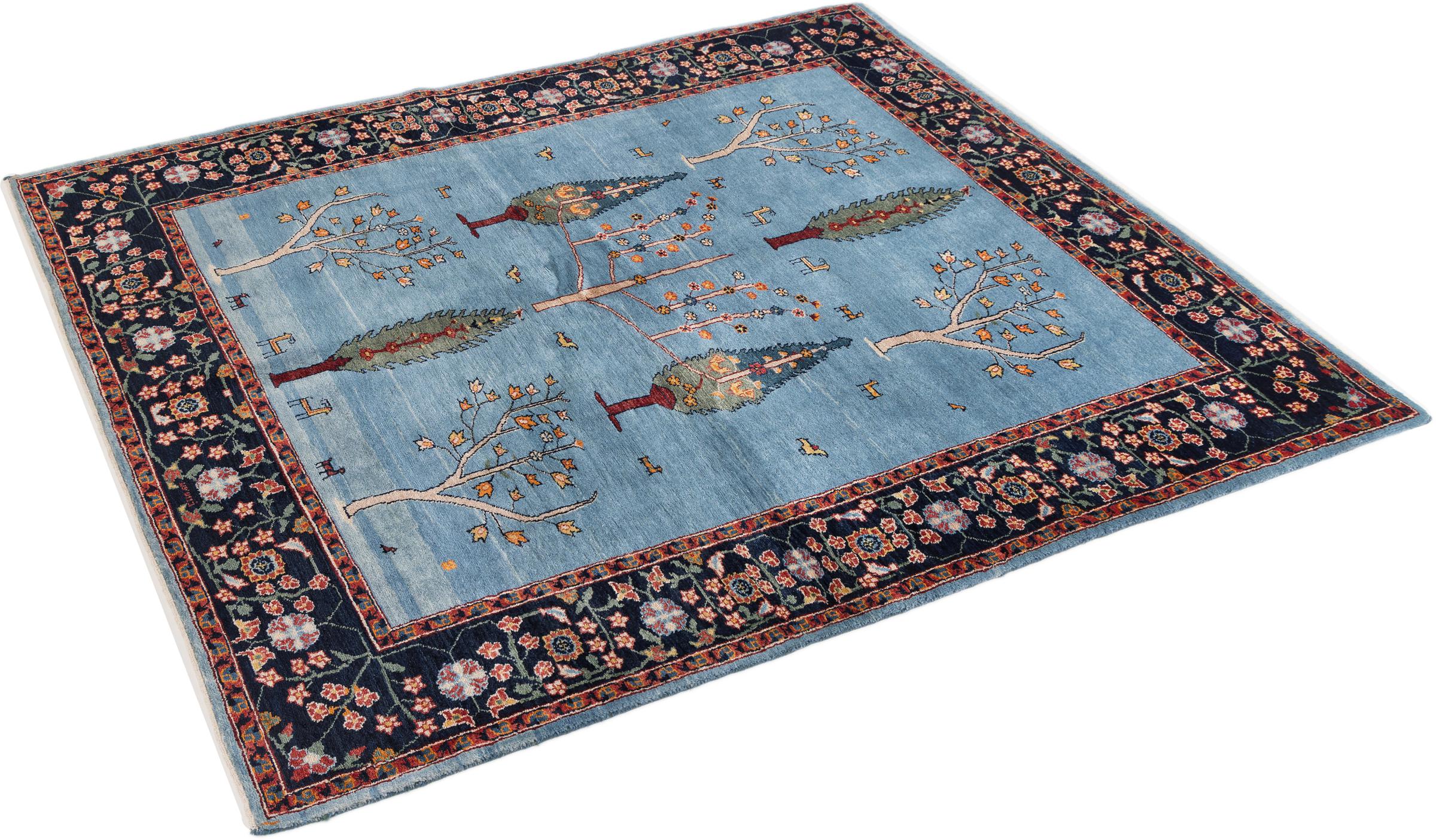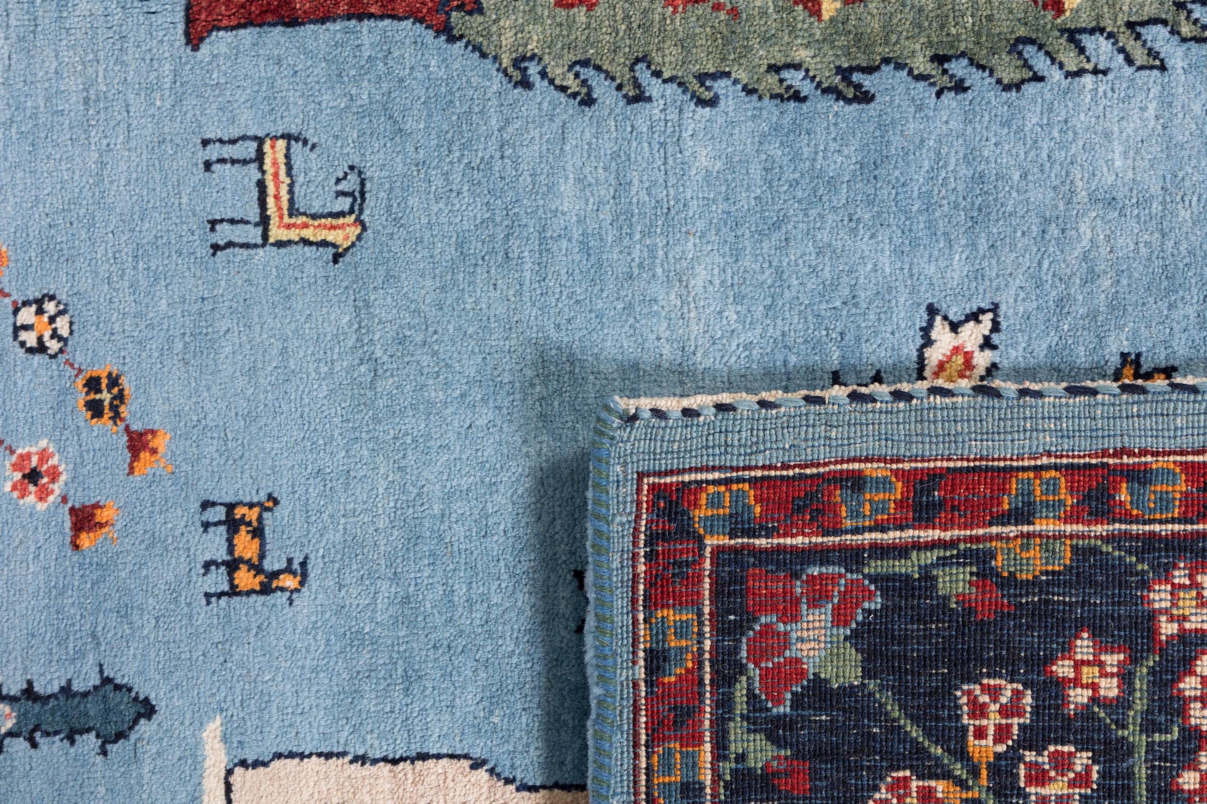 Den här vackra mattan är en persisk Gabbeh och är en av de högsta kvaliteten på Gabbeh-mattor. Mattorna är knutna av nomader eller semi-nomader i Iran med traditionellt hantverk. De enkla motiven och mönstren är mestadels inspirerade av nomaderna. Till exempel kan kameler, träd eller buskar hittas på traditionella mattor. Persiska Gabbeh-mattor är tillverkade av ull från lokala fårbesättningar. Ullen spinns därför mest för hand. Var och en av dessa orientaliska mattor förkroppsligar en unik karaktär av hundraårig kultur.
