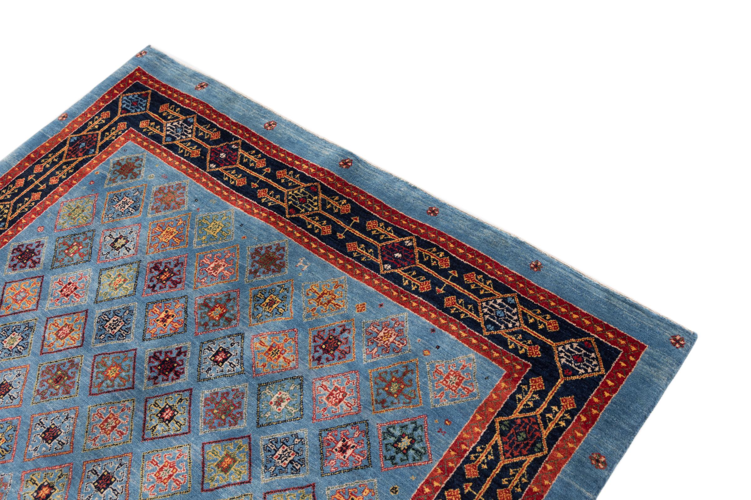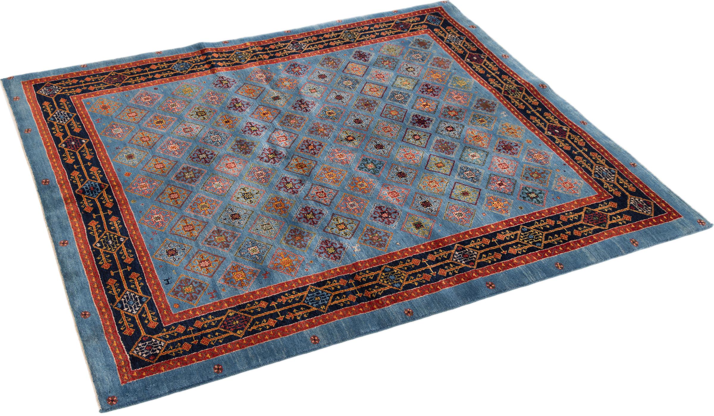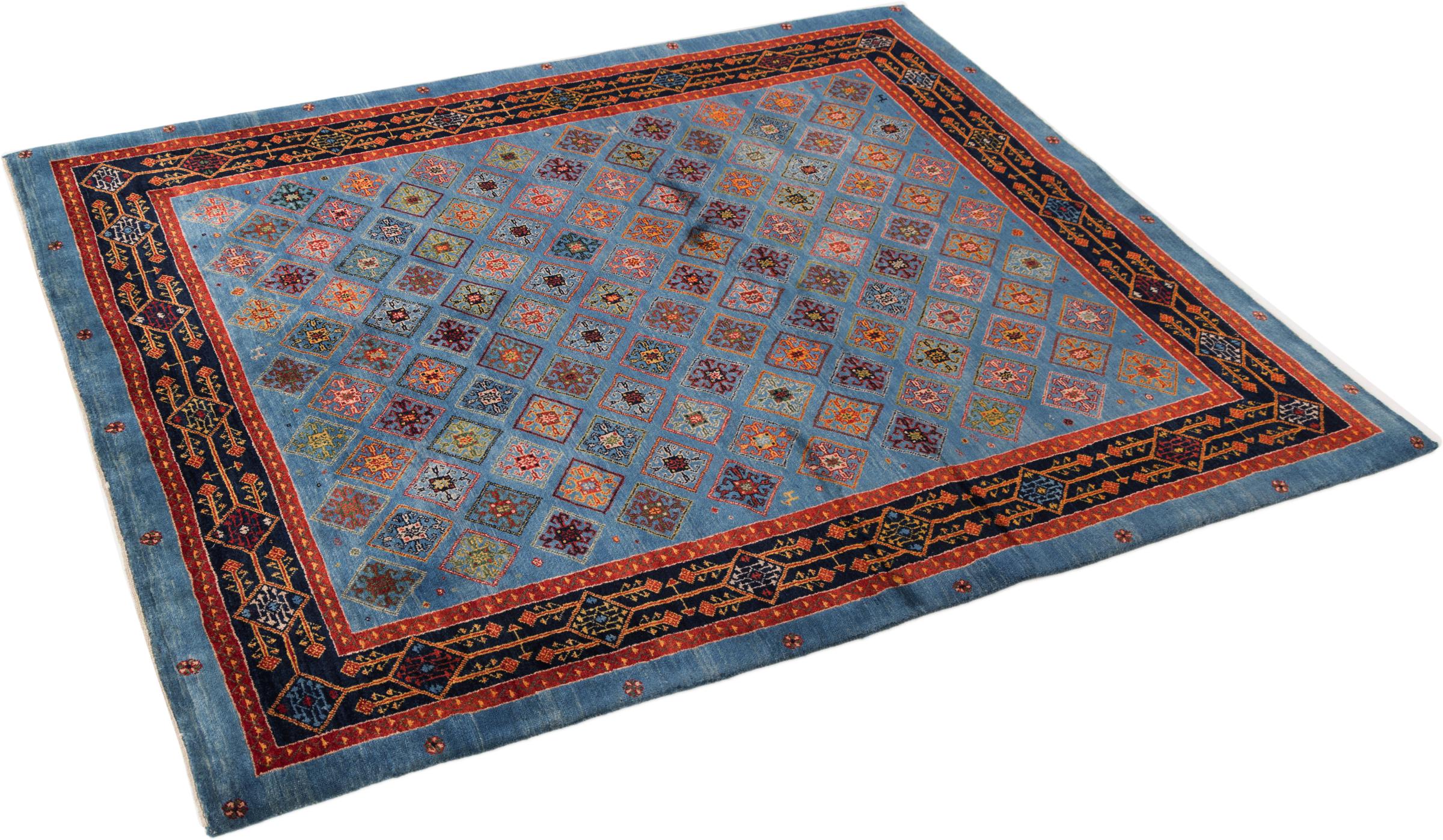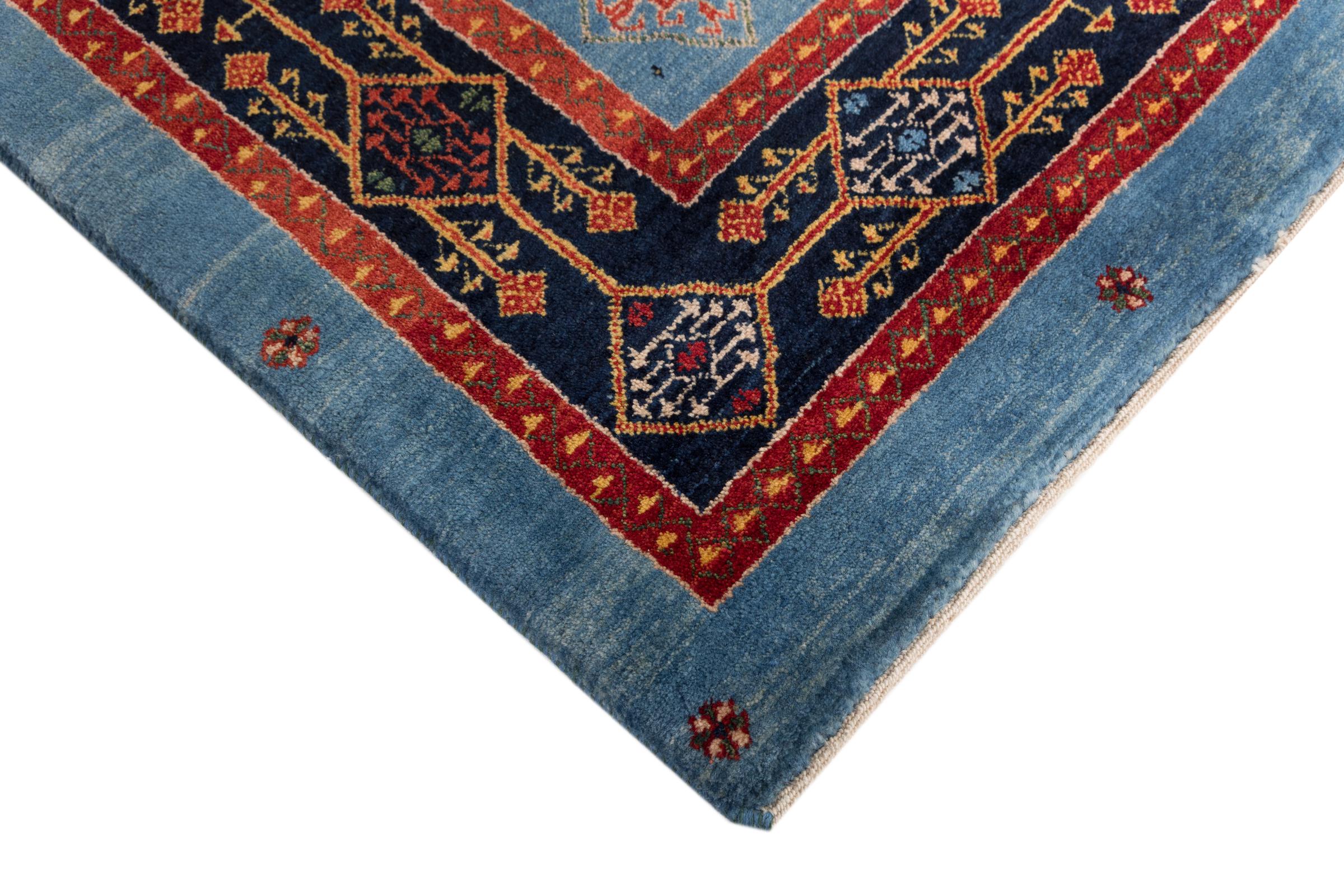 Den här vackra mattan är en persisk Gabbeh och är en av de högsta kvaliteten på Gabbeh-mattor. Mattorna är knutna av nomader eller semi-nomader i Iran med traditionellt hantverk. De enkla motiven och mönstren är mestadels inspirerade av nomaderna. Till exempel kan kameler, träd eller buskar hittas på traditionella mattor. Persiska Gabbeh-mattor är tillverkade av ull från lokala fårbesättningar. Ullen spinns därför mest för hand. Var och en av dessa orientaliska mattor förkroppsligar en unik karaktär av hundraårig kultur.