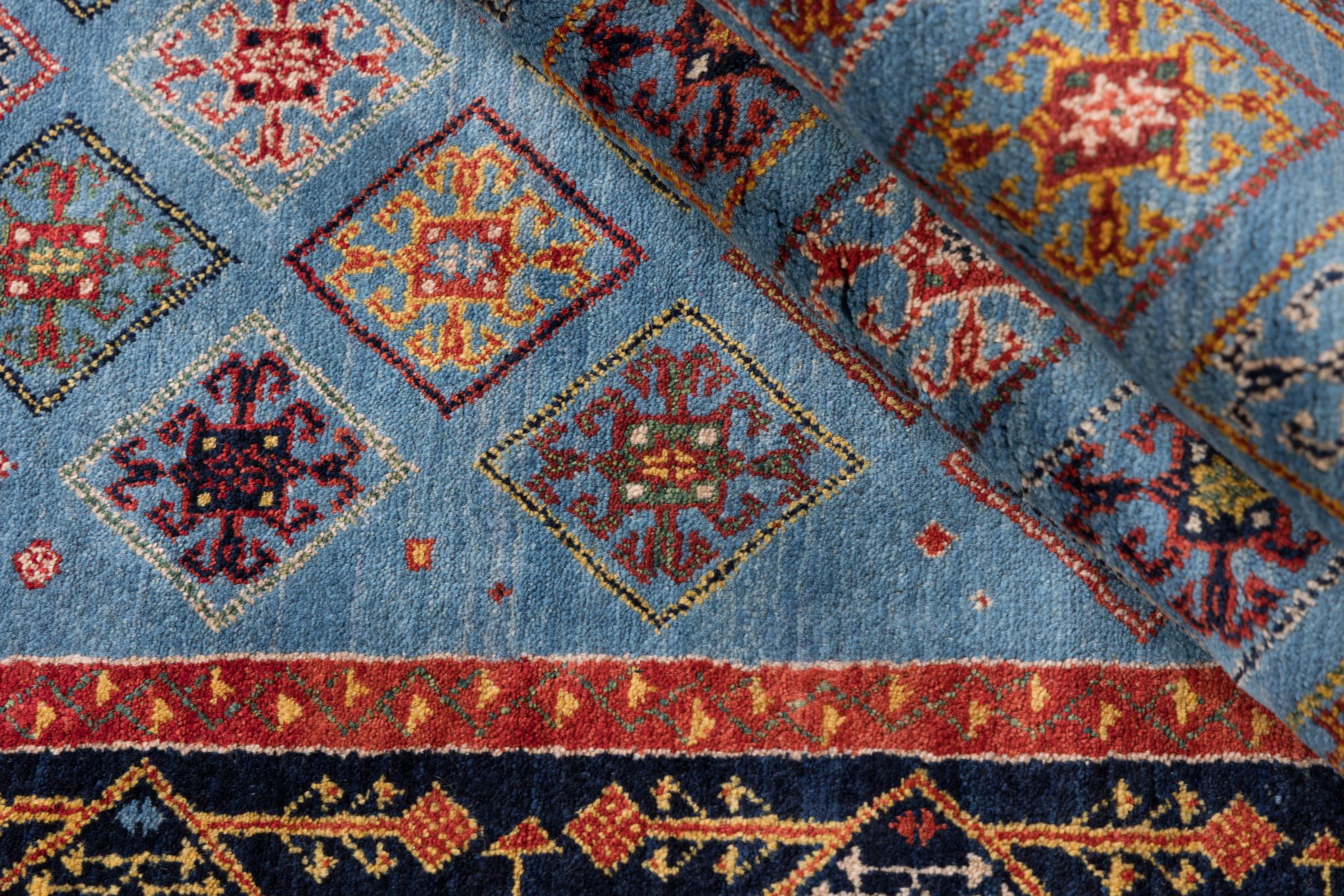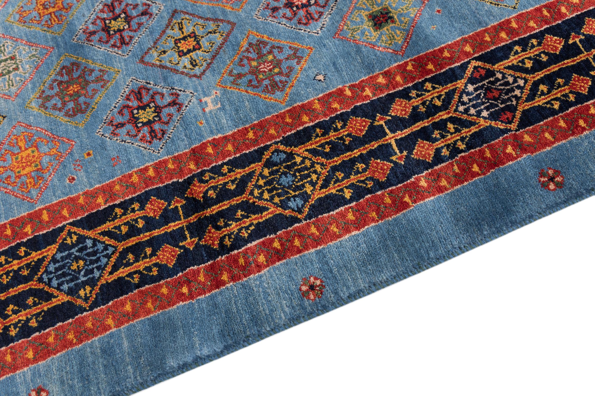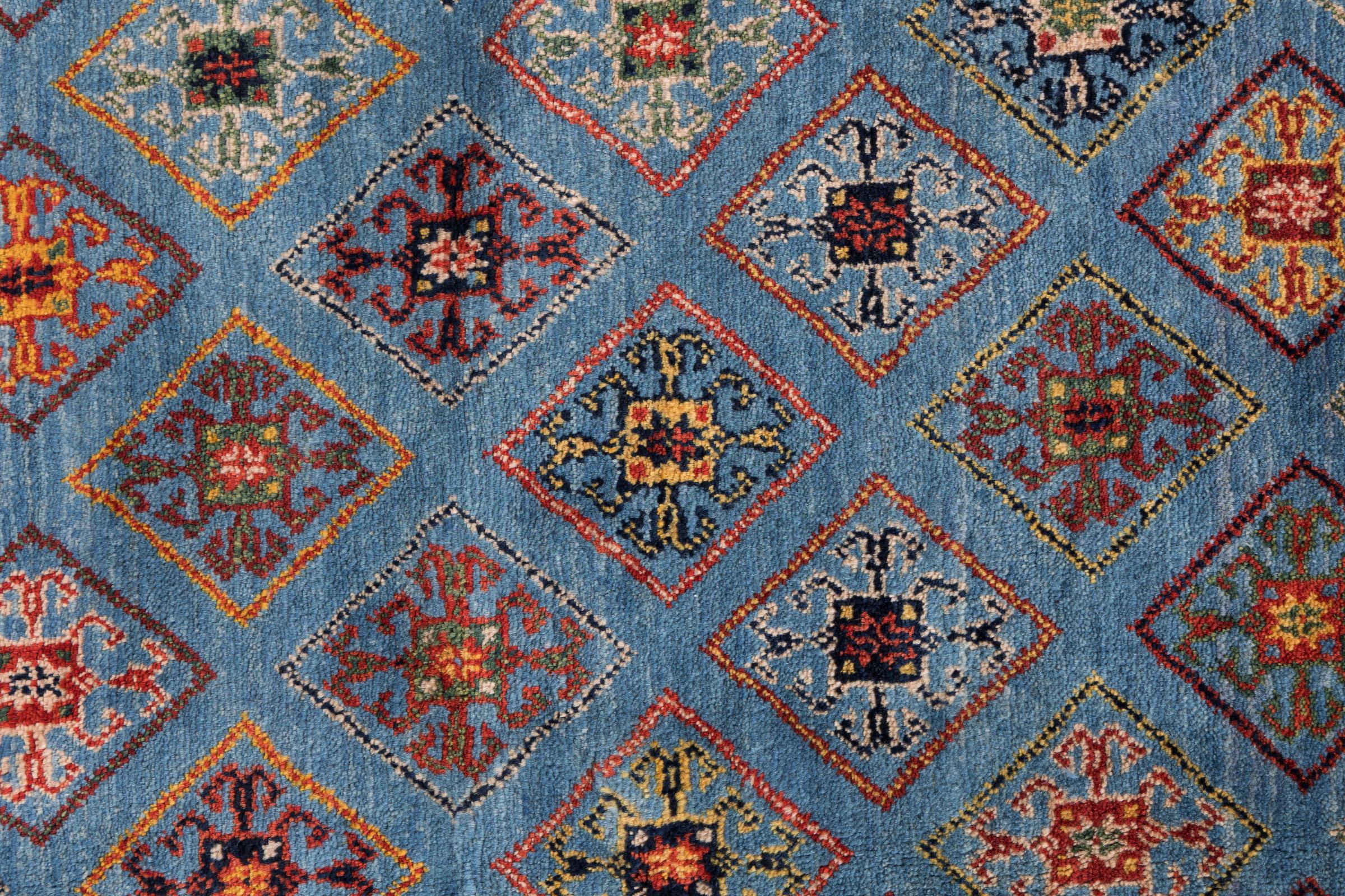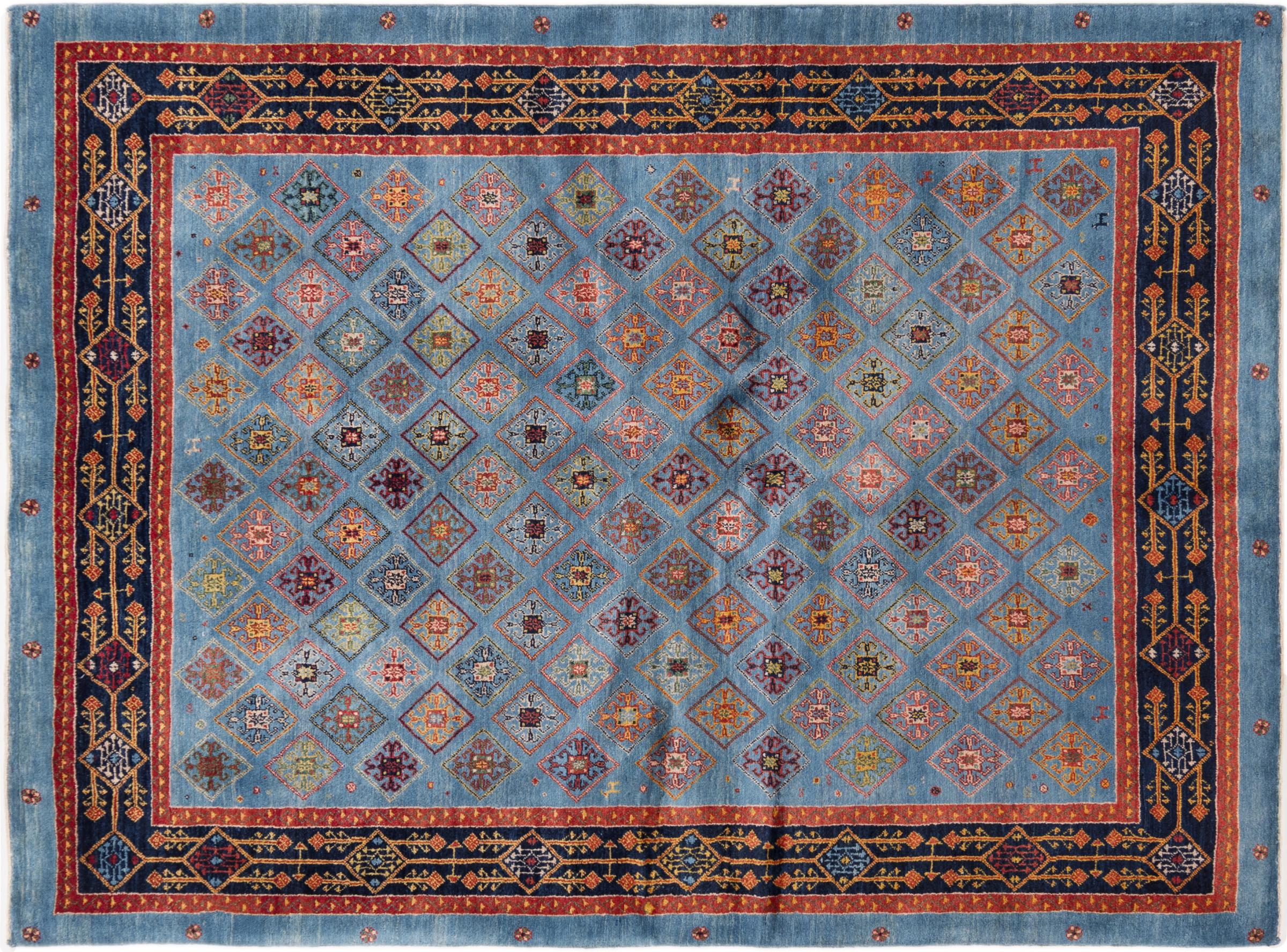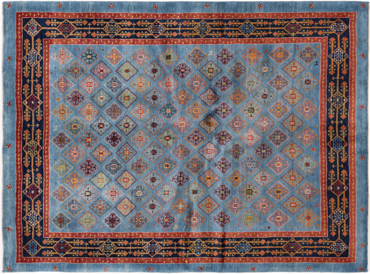 Den här vackra mattan är en persisk Gabbeh och är en av de högsta kvaliteten på Gabbeh-mattor. Mattorna är knutna av nomader eller semi-nomader i Iran med traditionellt hantverk. De enkla motiven och mönstren är mestadels inspirerade av nomaderna. Till exempel kan kameler, träd eller buskar hittas på traditionella mattor. Persiska Gabbeh-mattor är tillverkade av ull från lokala fårbesättningar. Ullen spinns därför mest för hand. Var och en av dessa orientaliska mattor förkroppsligar en unik karaktär av hundraårig kultur.