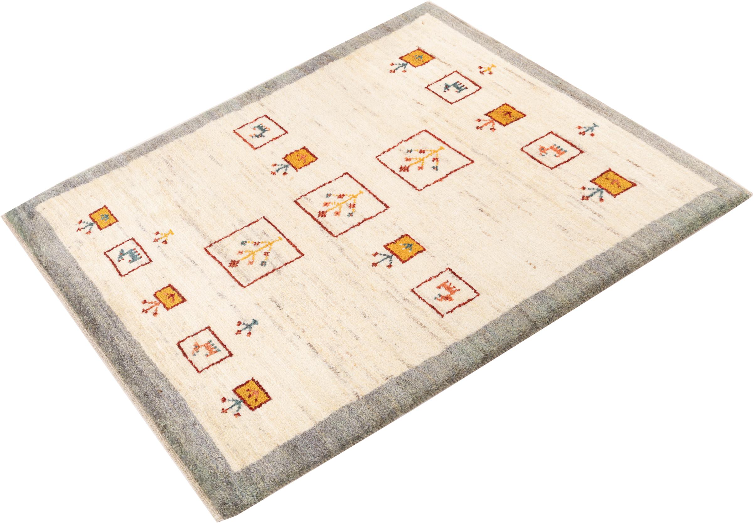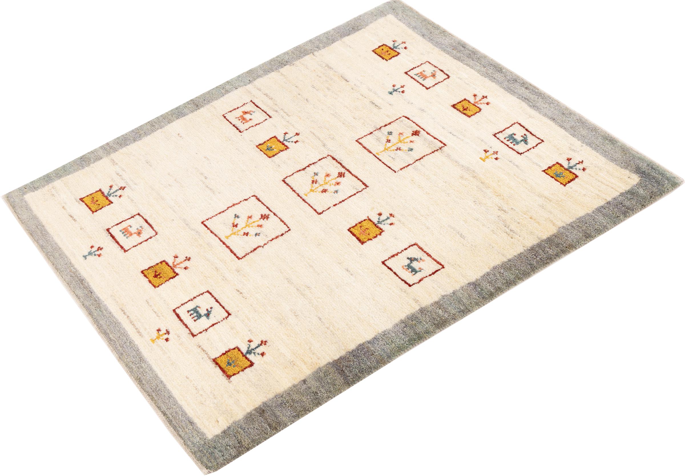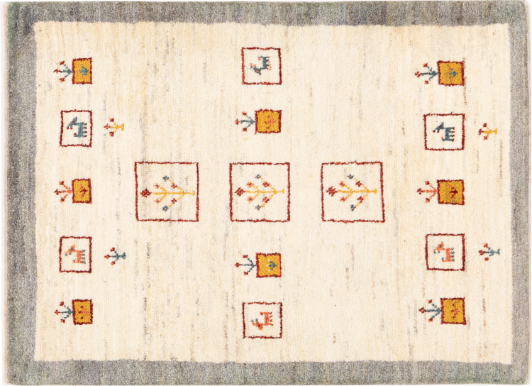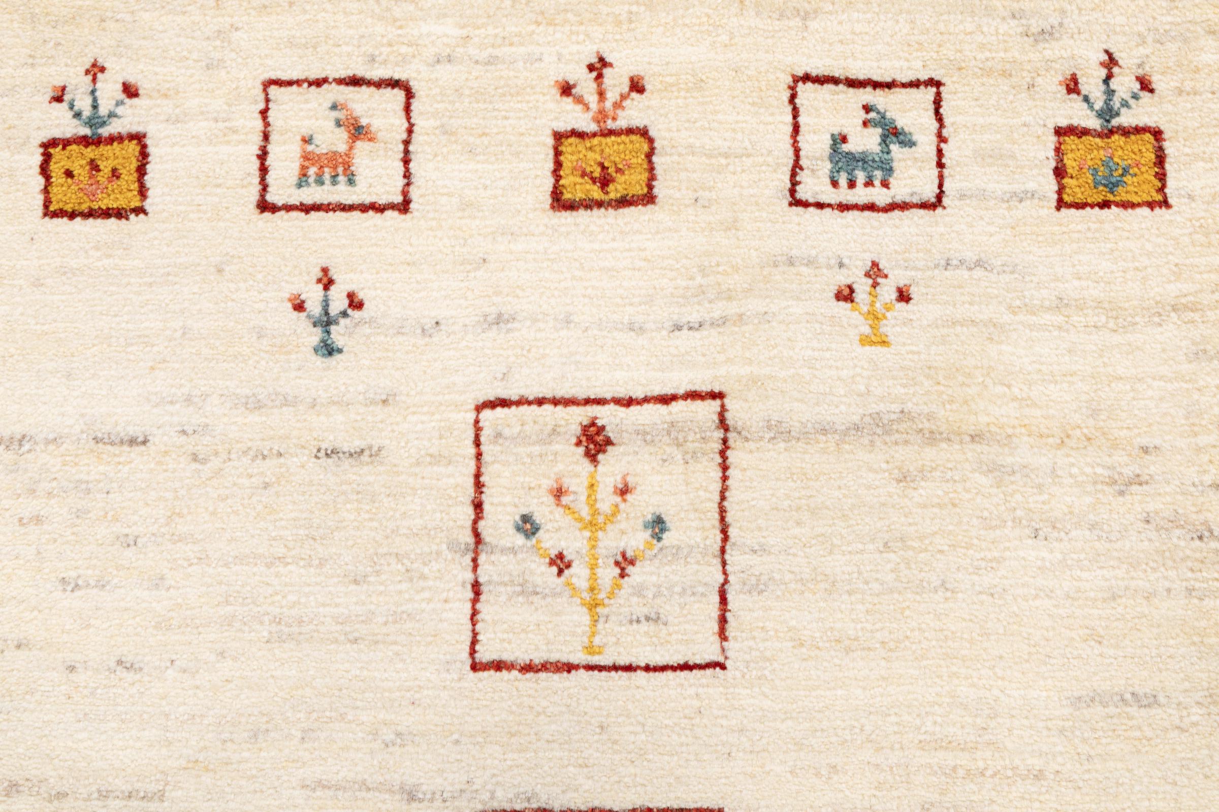 Den här vackra mattan är en persisk Gabbeh och är en av de högsta kvaliteten på Gabbeh-mattor. Mattorna är knutna av nomader eller semi-nomader i Iran med traditionellt hantverk. De enkla motiven och mönstren är mestadels inspirerade av nomaderna. Till exempel kan kameler, träd eller buskar hittas på traditionella mattor. Persiska Gabbeh-mattor är tillverkade av ull från lokala fårbesättningar. Ullen spinns därför mest för hand. Var och en av dessa orientaliska mattor förkroppsligar en unik karaktär av hundraårig kultur.