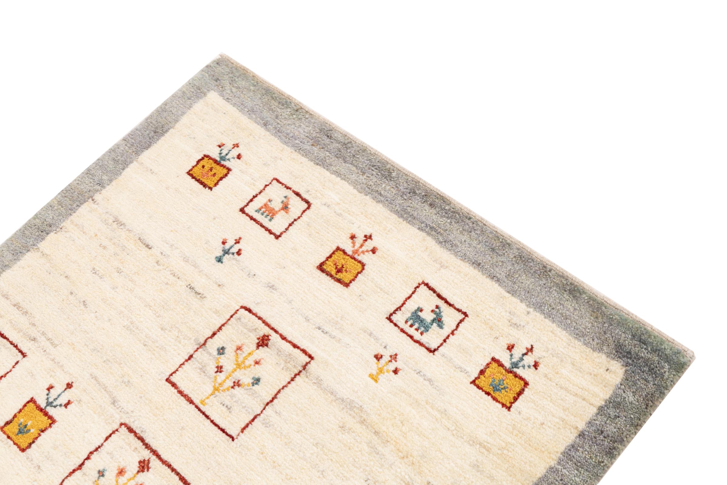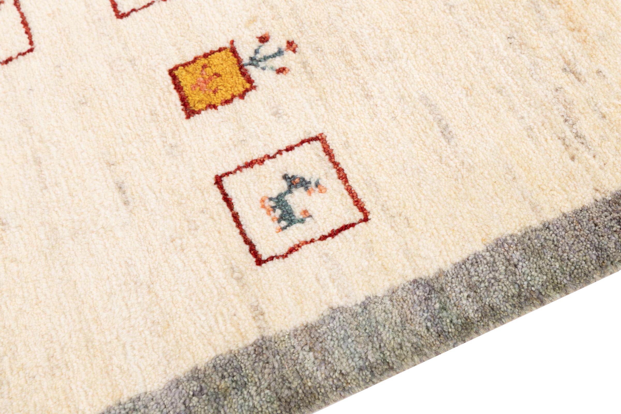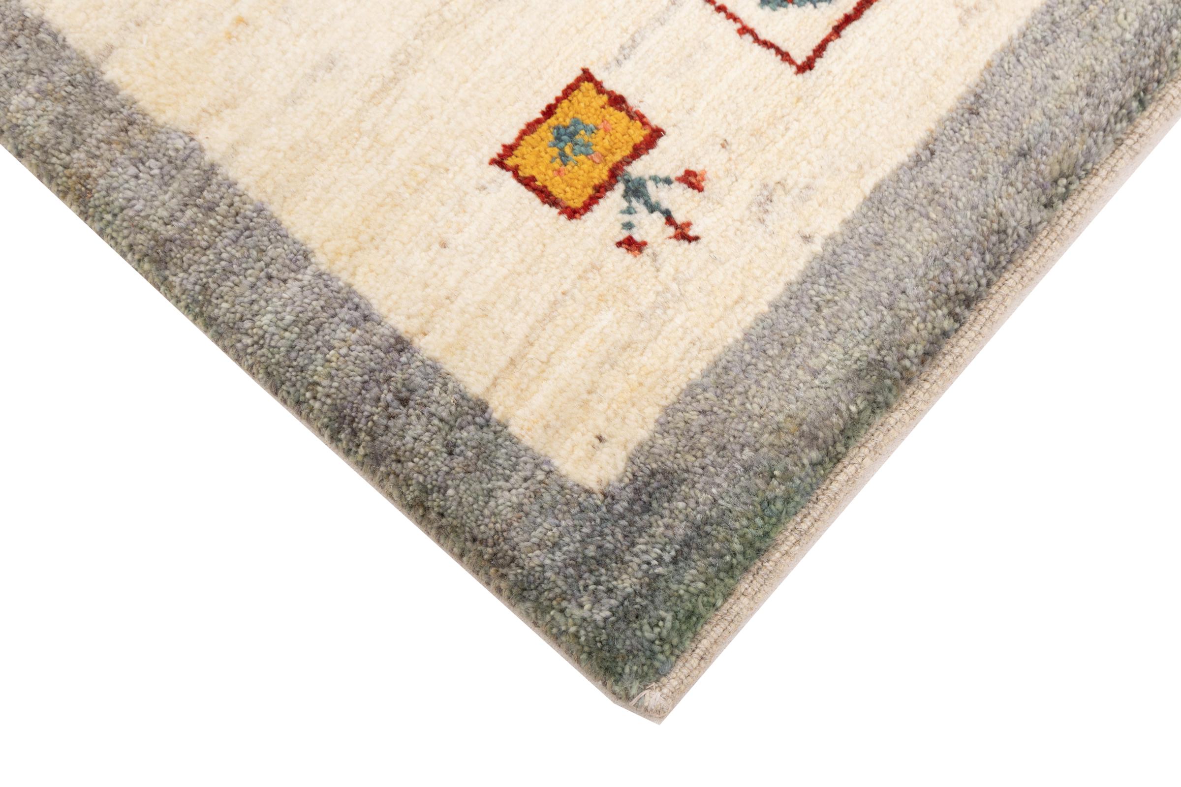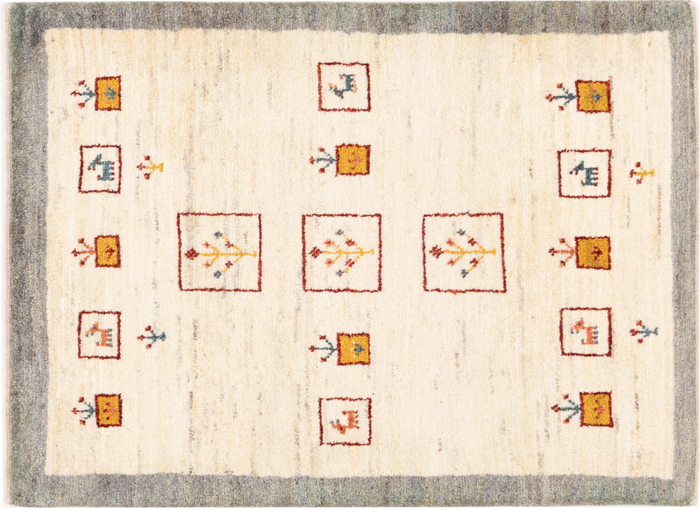 Den här vackra mattan är en persisk Gabbeh och är en av de högsta kvaliteten på Gabbeh-mattor. Mattorna är knutna av nomader eller semi-nomader i Iran med traditionellt hantverk. De enkla motiven och mönstren är mestadels inspirerade av nomaderna. Till exempel kan kameler, träd eller buskar hittas på traditionella mattor. Persiska Gabbeh-mattor är tillverkade av ull från lokala fårbesättningar. Ullen spinns därför mest för hand. Var och en av dessa orientaliska mattor förkroppsligar en unik karaktär av hundraårig kultur.