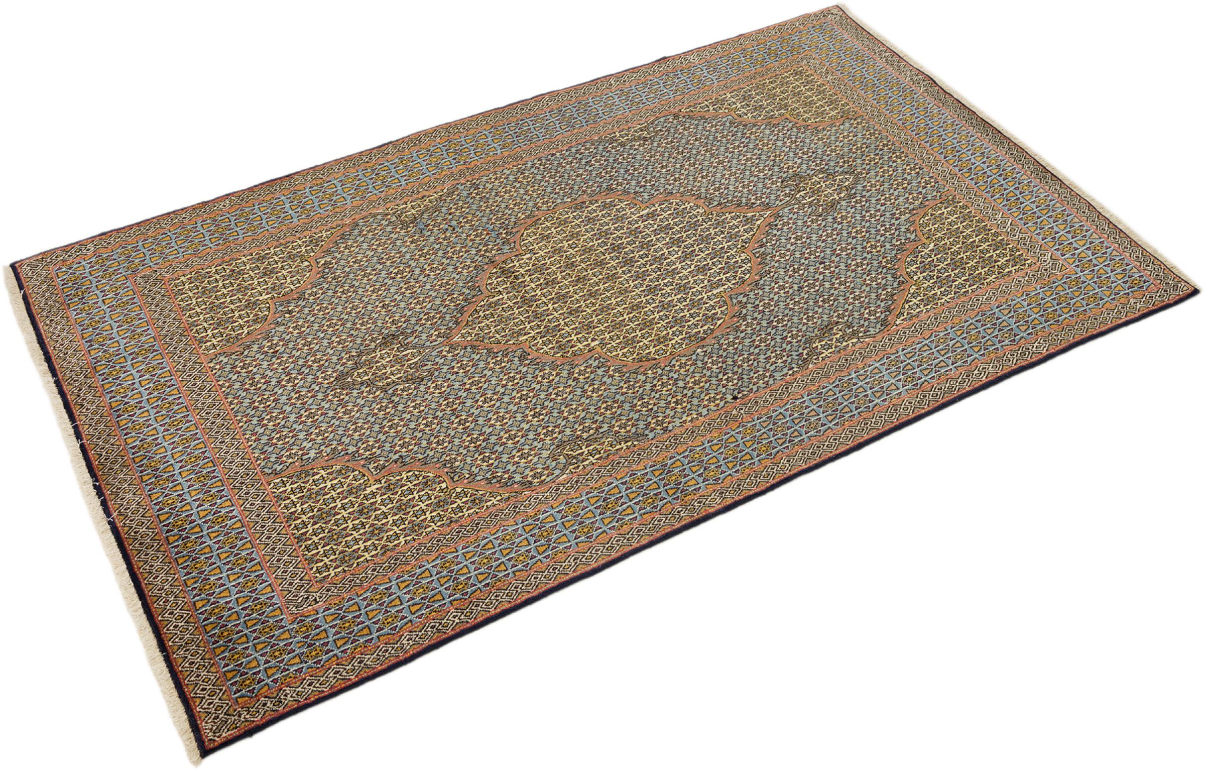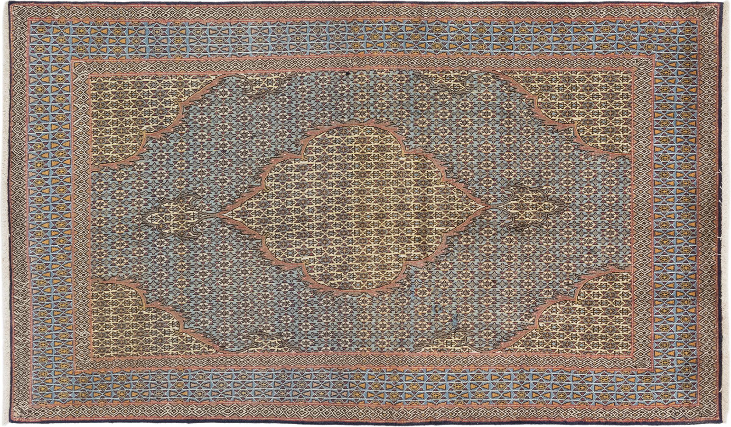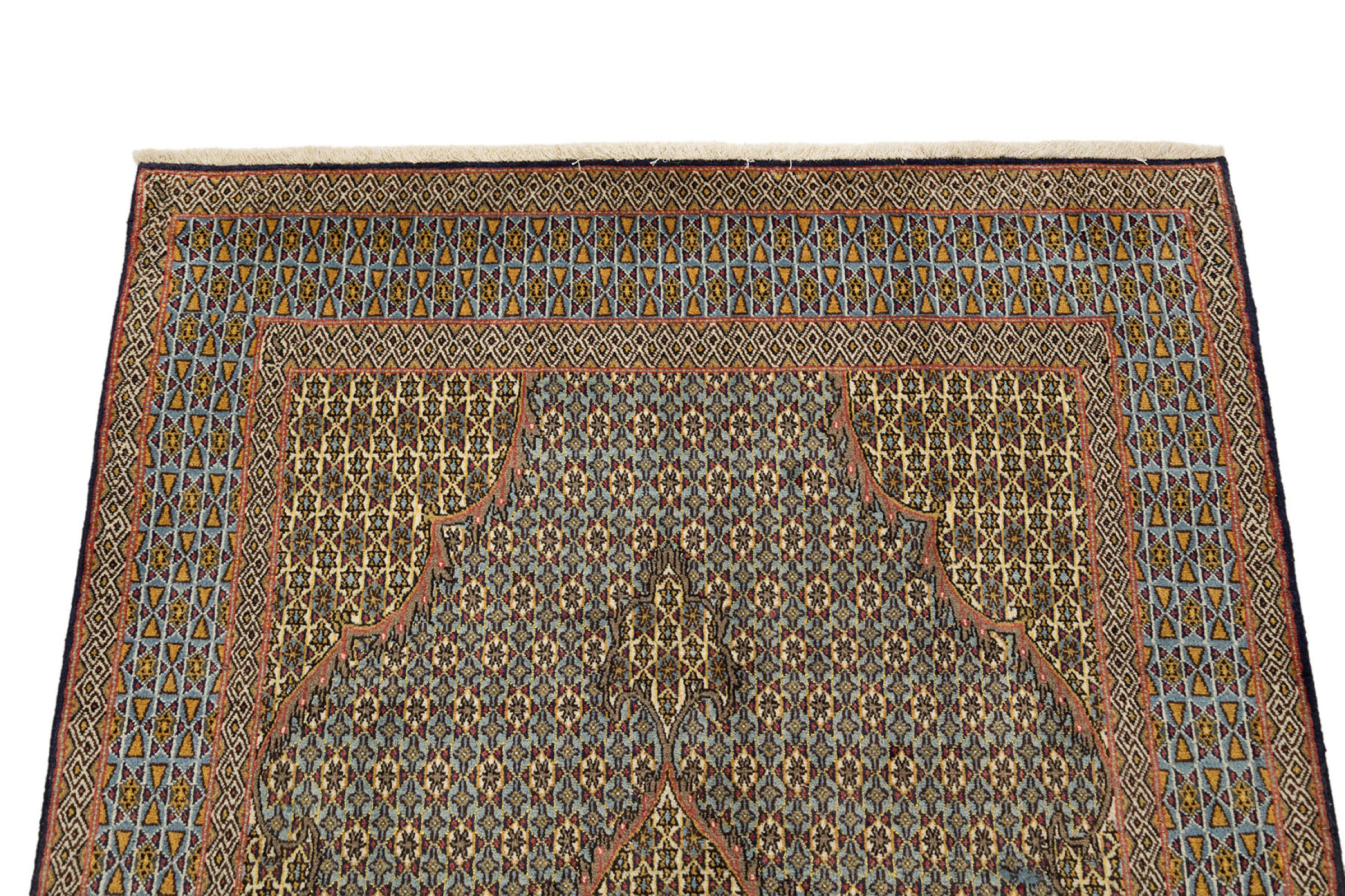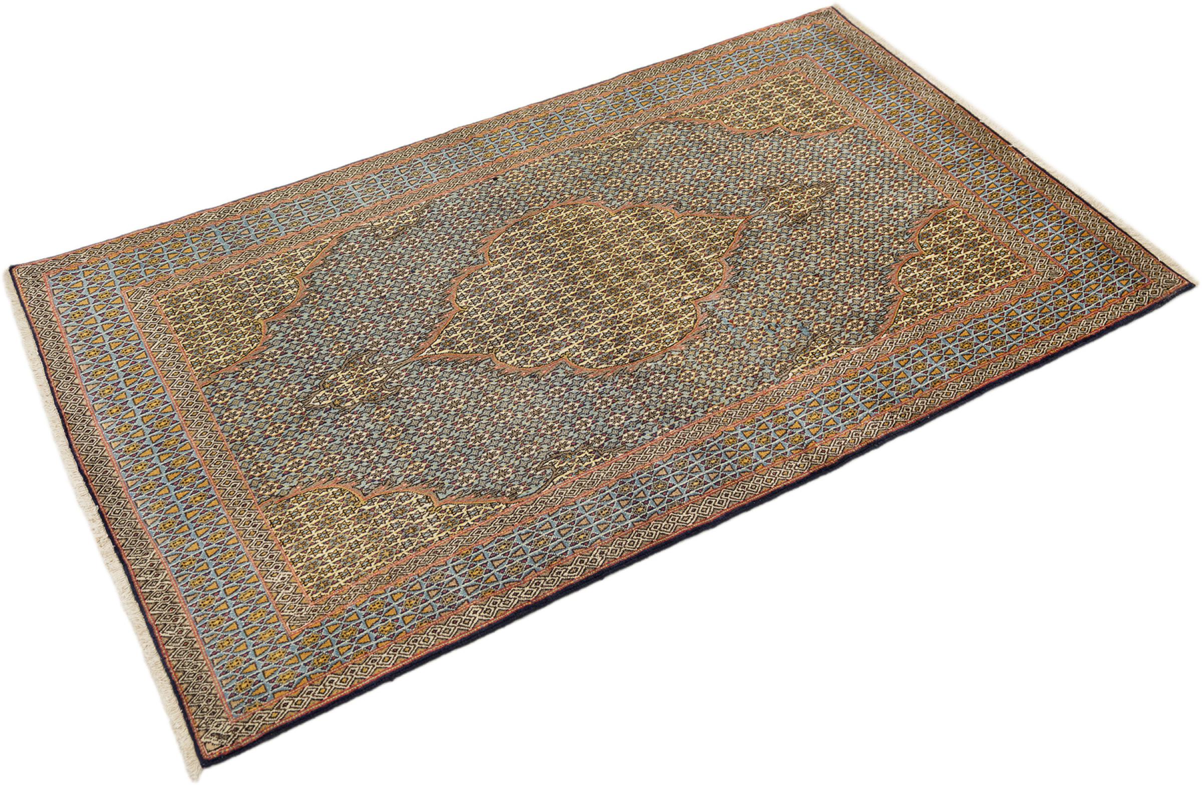 Mattans ID: 316476009522267 Storlek: 209x126 cm Tjocklek: ap. 10 mm Knuttäthet: 410 000 - 450 000 / m² Tillverkning: Knuten för hand Lugg: Handspunnen ull Varp: Bomull Skick / Bevarande: Perfekt Ursprung: Persien / Iran Ålder: Antik, äldre än 80 år Vikt: ap. 9 kg I lager: Unik - Endast 1 i lager