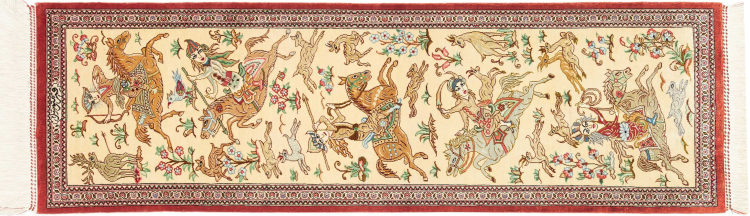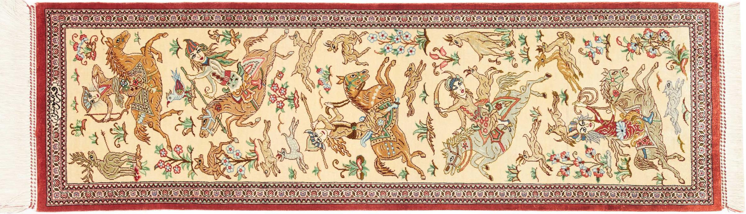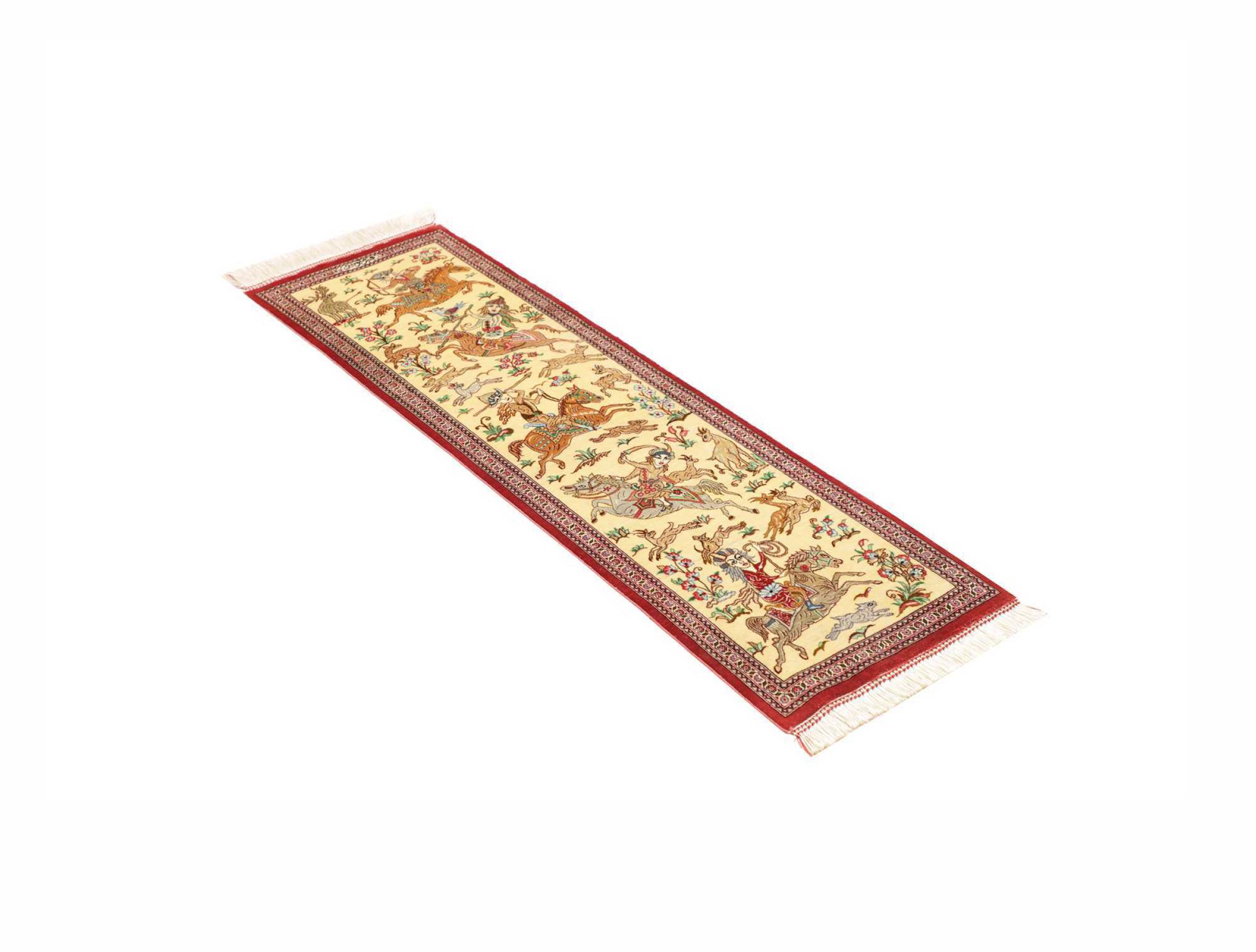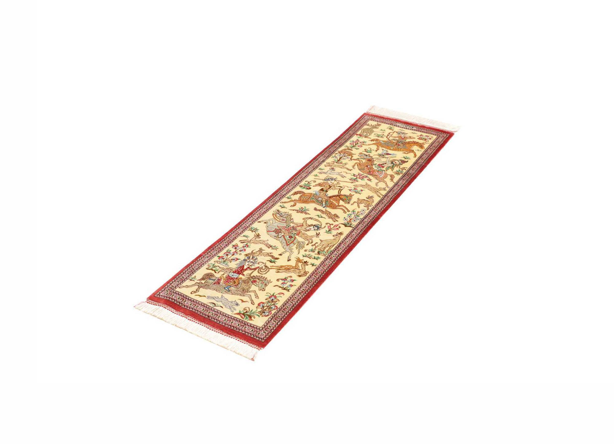 Mattans ID: 306187006735785 Storlek: 131x37 cm Tjocklek: ap. 4 mm Knuttäthet: 800 000 / m² Tillverkning: Knuten för hand Lugg: Silke Varp: Bomull Ursprung: Persien / Iran Ålder: Ny Vikt: ap. 1 kg I lager: Unik - Endast 1 i lager