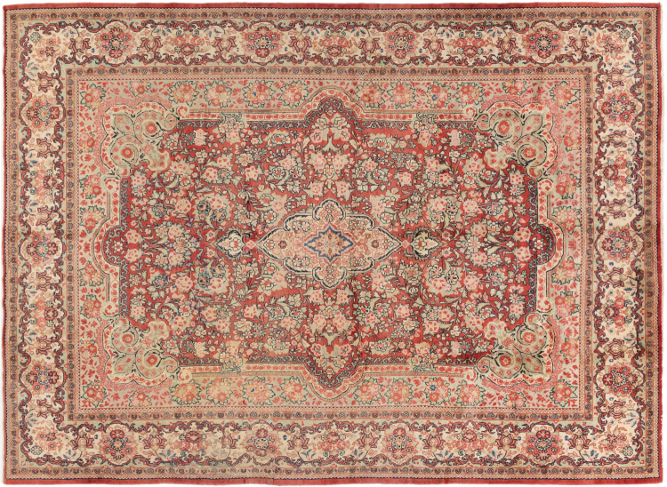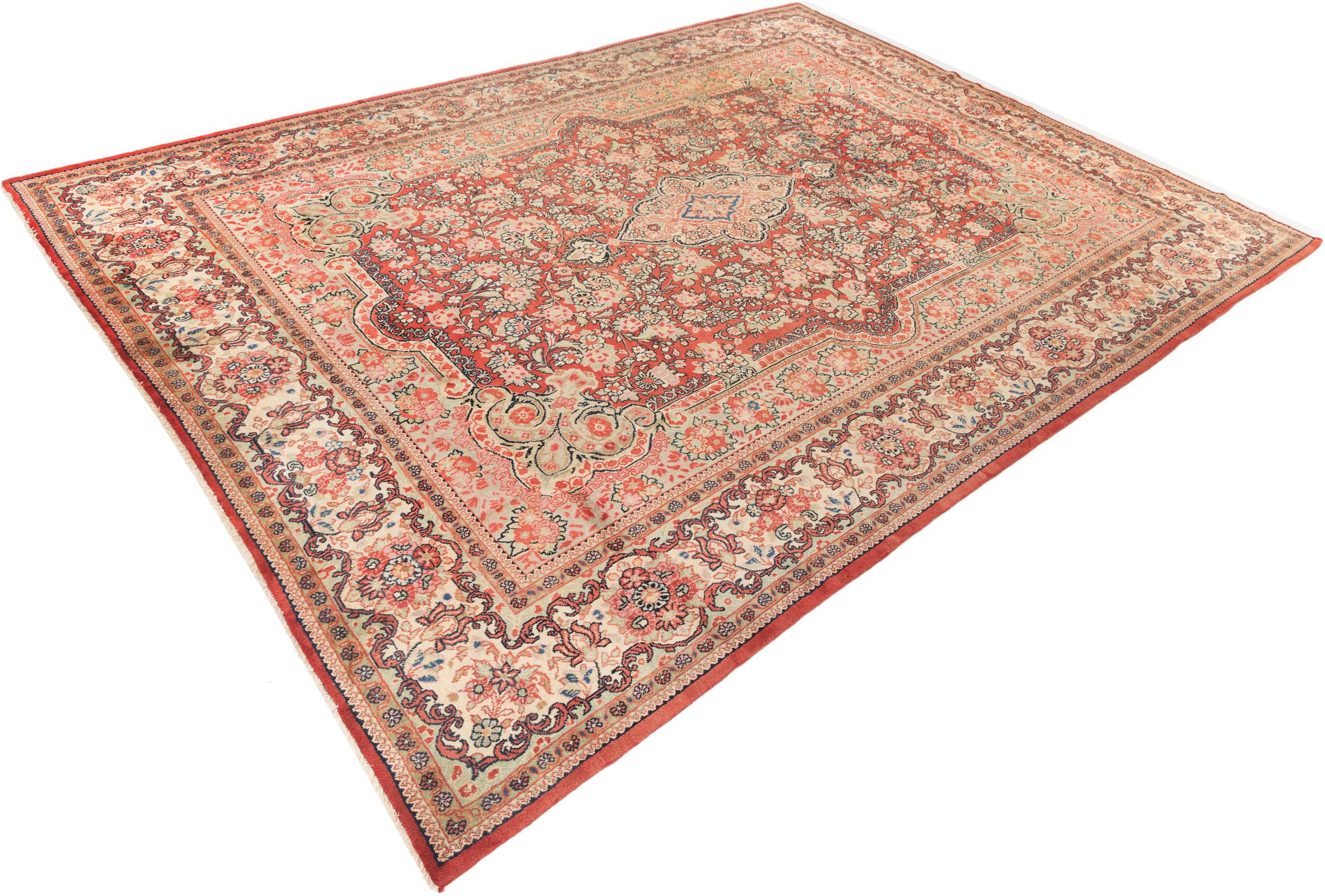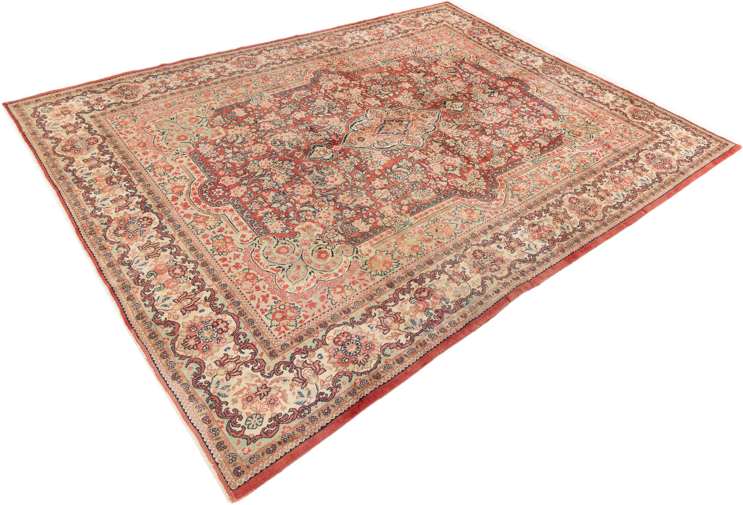 Mattans ID: 29512100794 Storlek: 438x320 cm Tjocklek: ap. 10 mm Knuttäthet: 96 000 - 120 000 / m² Tillverkning: Knuten för hand Lugg: Handspunnen ull Varp: Bomull Ursprung: Persien / Iran Ålder: Gammal/Halvantik, äldre än 50 år Vikt: ap. 49 kg I lager: Unik - Endast 1 i lager